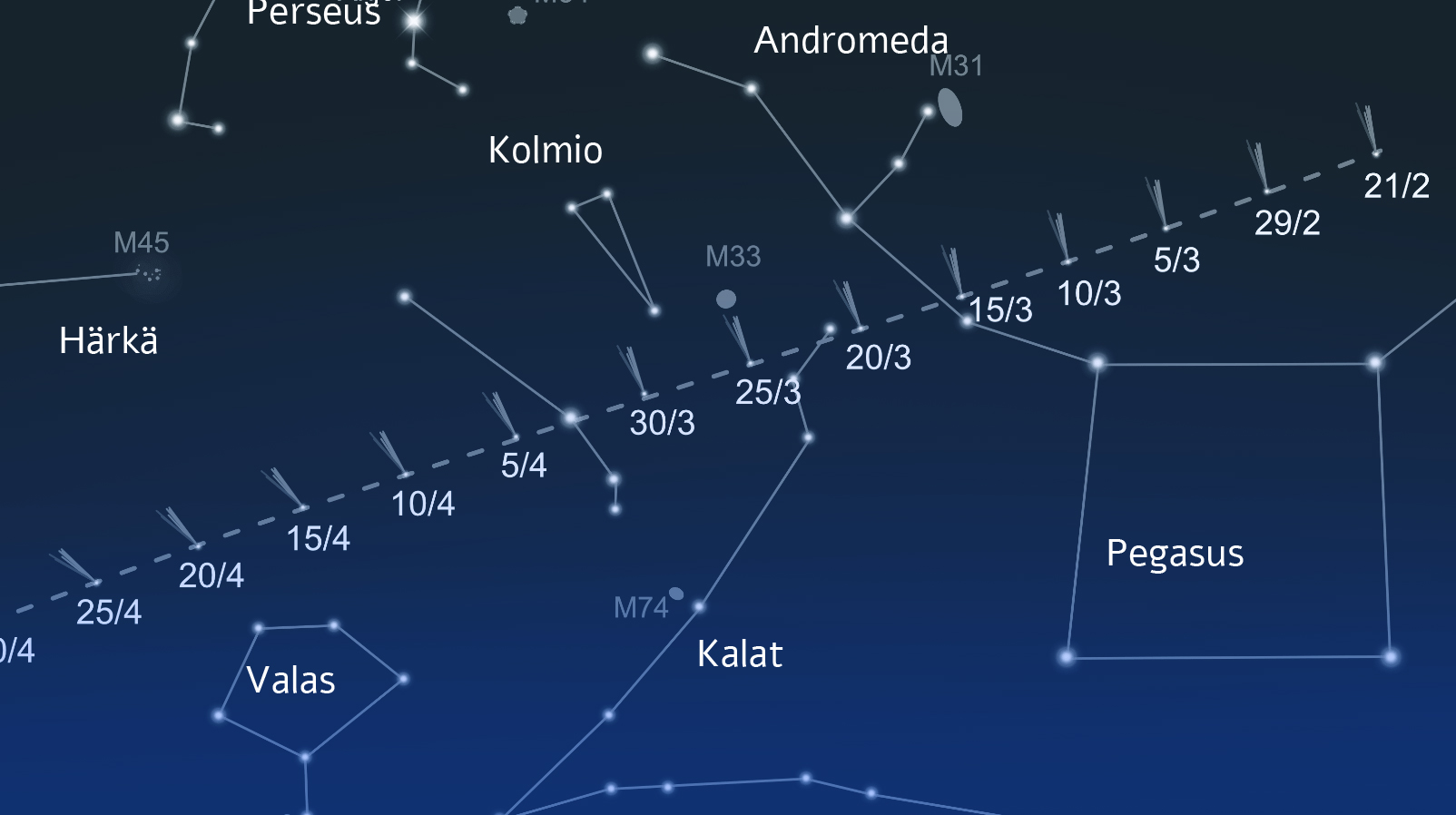 Komeetta kulki kevättalvella länsitaivaalla Pegasuksen alueelta kohti Oinasta, Valasta ja Härkää. Komeetan näennäinen liike taivaalla oli noin aste vuorokaudessa. Se oli parhaiten näkyvissä suunnilleen 20.2.-20.3. Tämän jälkeen kasvava Kuu alkoi vaalentamaan taustataivasta, samalla kun komeetta painui alemmas kohti läntistä horisonttia.
