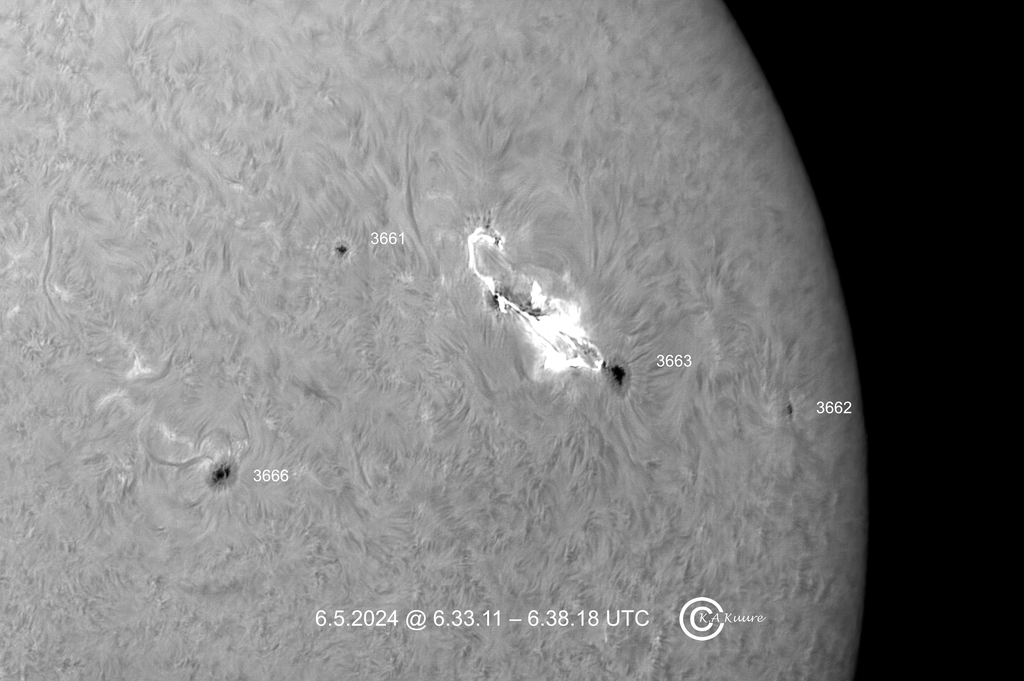 X4.52 flarepurkaus! Jälleen aamu auringonkuvauksen parissa. Pilkkuryhmässä AR 13553 käynnistyi flarepurkaus, kun olin kuvaamassa CaK-kuvia. Huomasin pilkkuryhmässä kaksi kirkasta aluetta (uv-valossa voimakaskaan purkaus ei ole kovin kirkas, koska ilmakehä suodattaa uv-valoa voimakkaasti.