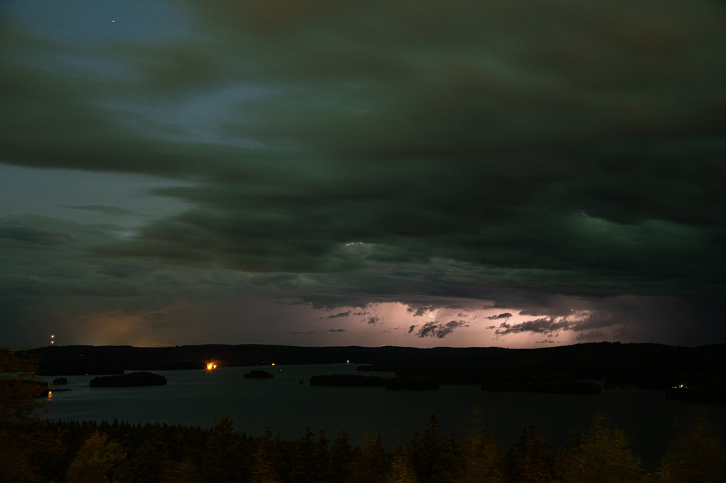 Huomasin salamoita tutkassa, joten lähdin näkötornille kuvailemaan josko irtoaisi salamoita kamerallekin. Sieltähän irtosi sitten sekä salamoita että revontulia samoihin kuviin. Ensimmäistä kertaa koskaan tuli onnistuttua tässä.