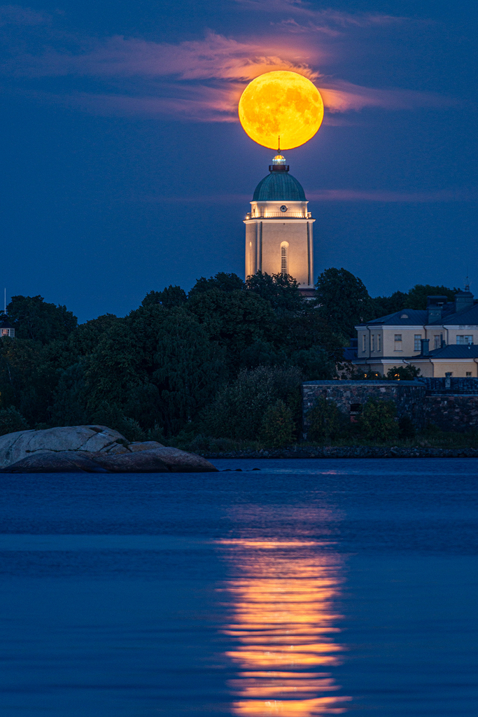 • Pekka Saastamoisen täysikuu elokuulta: “Kuukuvauksia Kaivopuistossa.” Hieno kuva, jossa Suomenlinnan kirkon majakan ylle kuvattuna täysikuu.