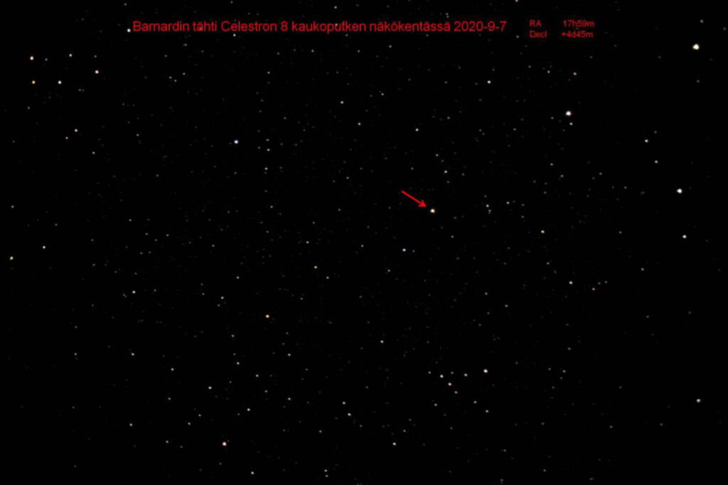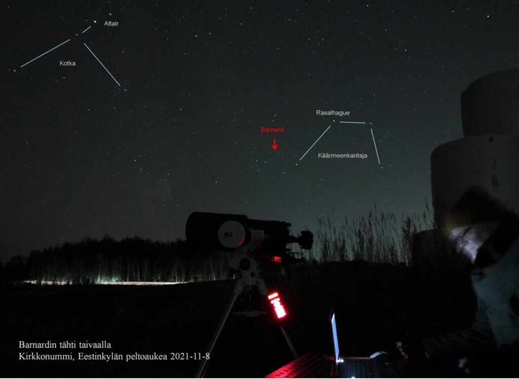 Olen kuvannut Barnardin tähteä Kirkkonummella joka syksy vuodesta 2017 alkaen. Ajatuksena oli saada sen liike taivaalla näkyviin ottamalla joka vuosi siitä uuden kuvan. Kävi ilmi että liike näkyy hyvin jo kahdessa vuoden välein otetussa kuvassa.