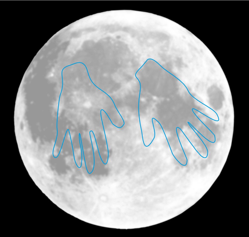 - Kuva 10. Intiassa Kuun pinnalla nähdään Astangi Matan kädet. Hindulaisen legendan mukaan Astangi Mata lähetti lapsensa taivaalle Auringoksi ja Kuuksi.