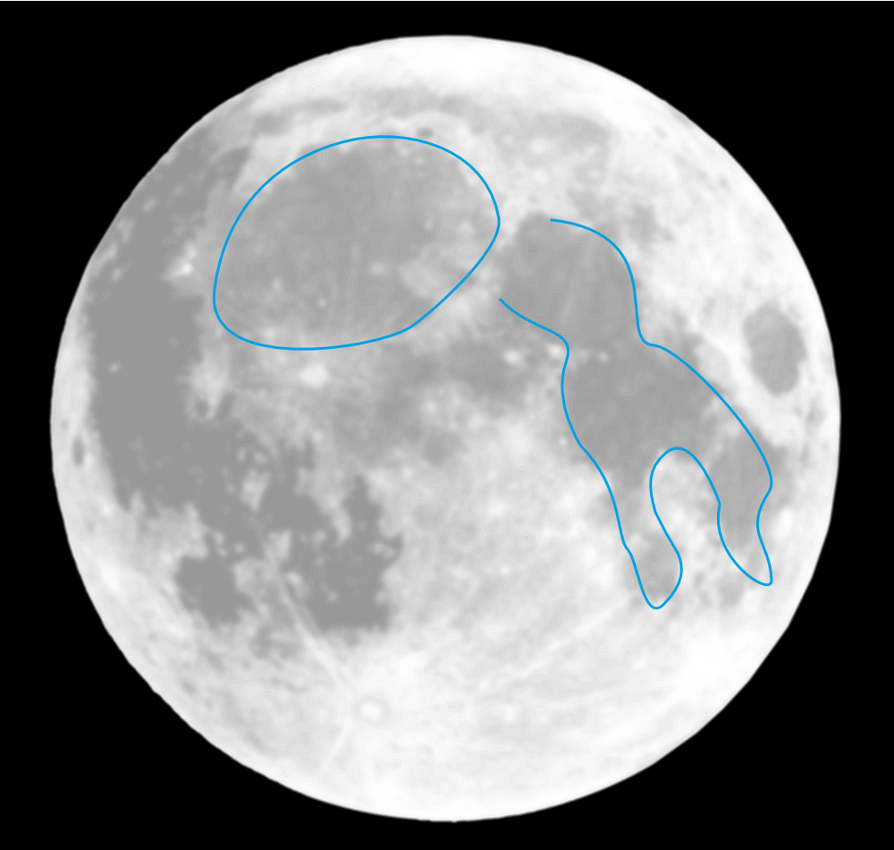 Kuva 4. Uudessa-Seelannissa tunnettu Rona-naishahmo Kuussa. Eteläisellä pallonpuoliskollamme Kuu, samoin kuin tähtikuviot, näkyvät ylösalaisin pohjoiseen pallonpuoliskoon verrattuna.