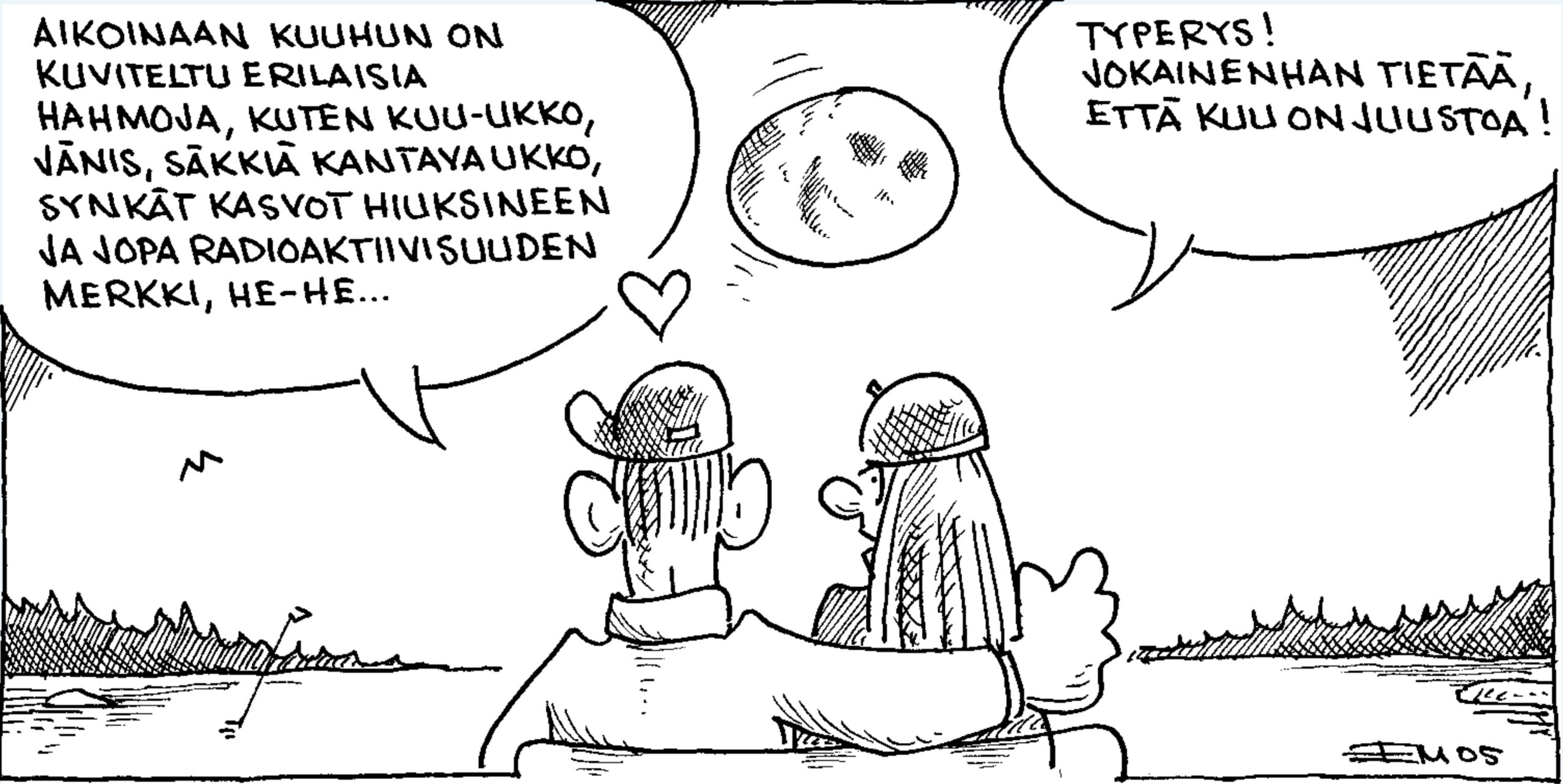 Kuu on kohteena sen verran lähellä, että siitä erottaa hahmojen ja Kuu-ukon kasvojen lisäksi enemmänkin yksityiskohtia. Kuuta voi siksi käyttää myös näkötestinä.
