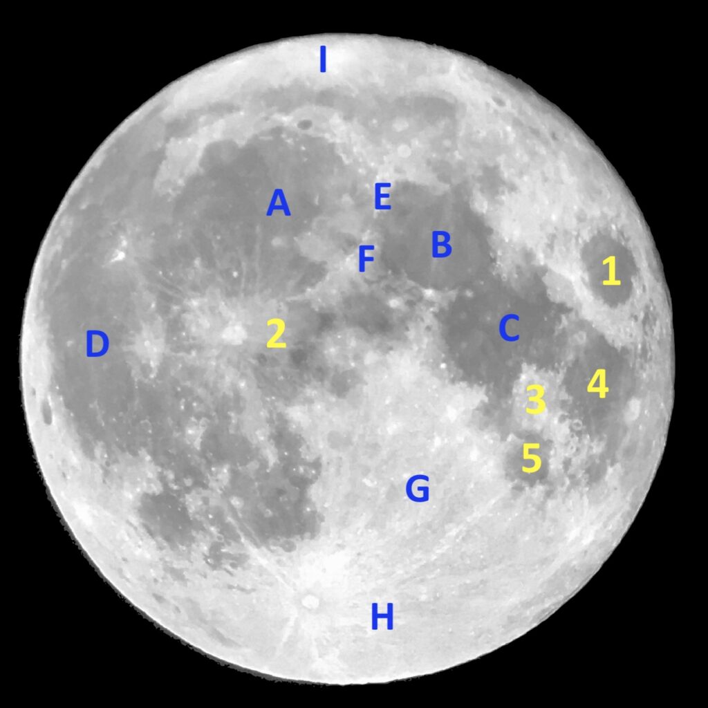 Havaintojen lämmittelyksi voi tarkastella Kuun meriä etsien Kuu-ukon naaman. Kun Kuu-ukon silmät (Mare Imbrium (A) ja Mare Serenitatis (B)) saa hahmotettua, löytyy niitä erottavana kannaksena Kaukasus (E) sekä Apenniinit (F).