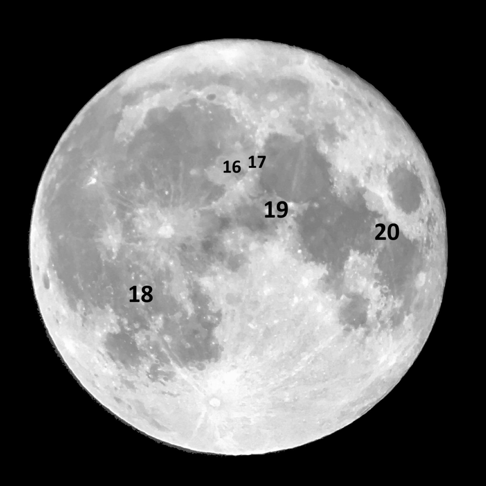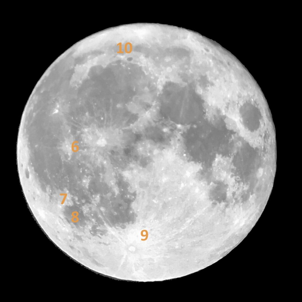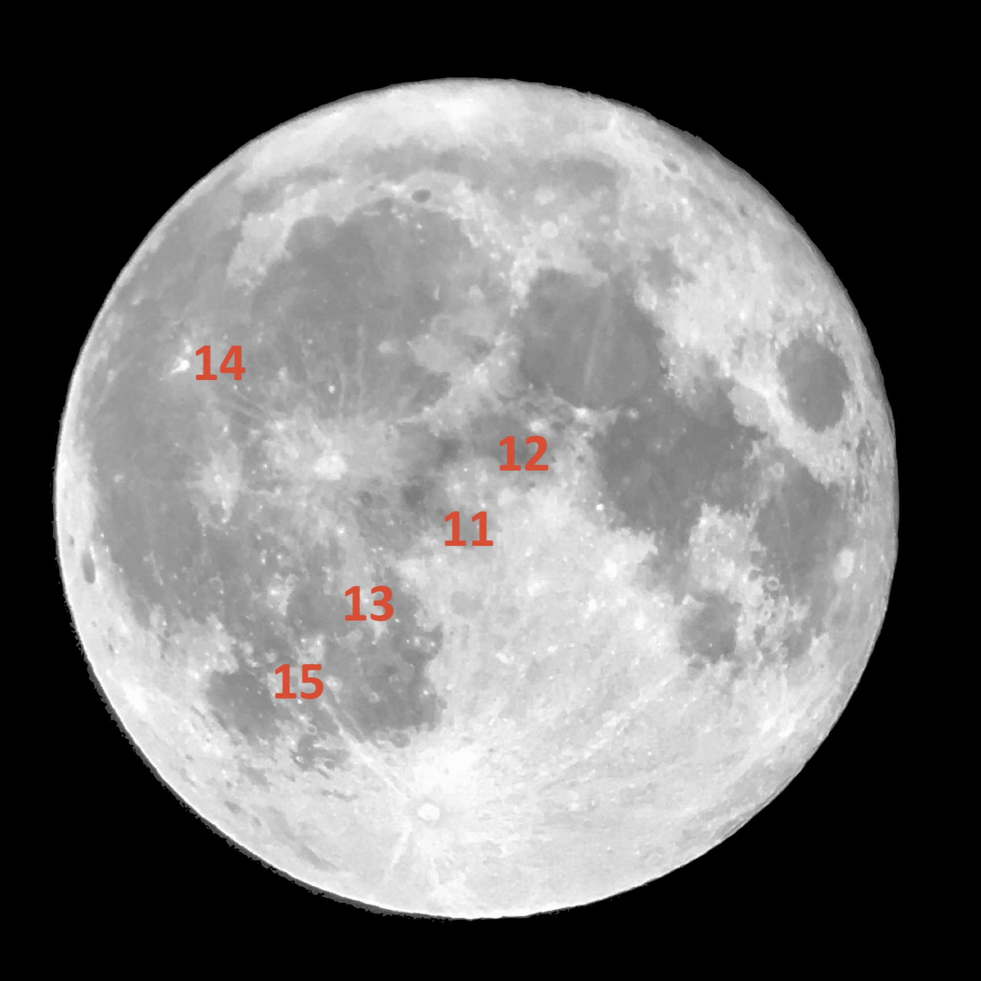 Kirkas Aristarchuksen alue (14) erottuu pienenä kirkkaana pisteenä mare-alueen keskellä ja onkin koko Kuun oikeasti kirkkain kohta. Sen sijaan Mare Humorumin vierellä oleva Agatharchideksen alue (15) on hankalampi, koska kontrastiero ei ole kovin suuri.