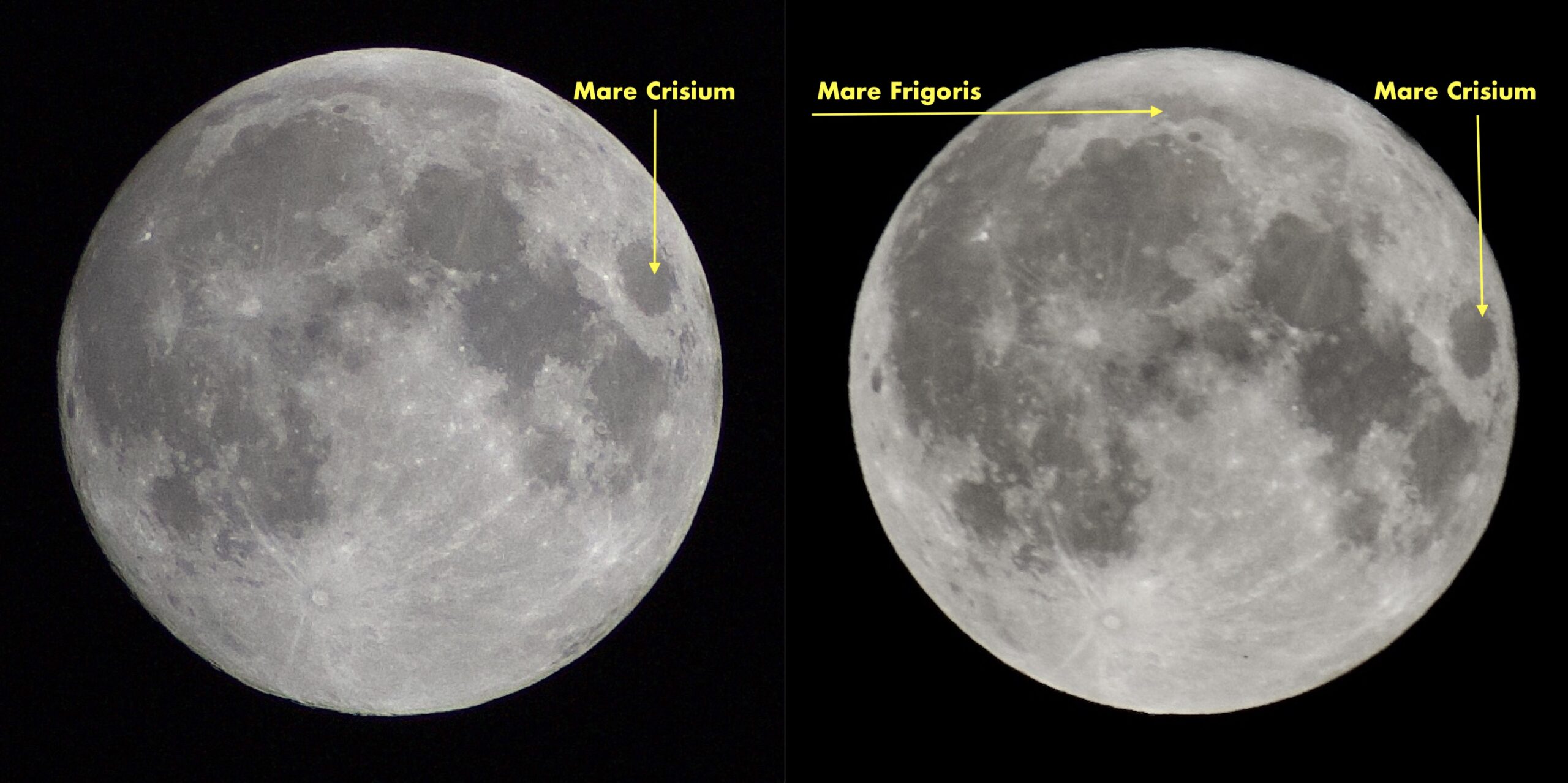 Kuva 25. Kuun libraation ansiosta Kuu-ukko tuntuu joskus katsovan hieman vinoon. Vasemmassa kuvassa libraatiota on itään ja Mare Crisium näkyy varsin kaukana reunasta verrattuna oikeanpuoleiseen kuvaan. Vastaavasti oikeanpuoleisessa kuvassa Oceanus Procellarumin länsireuna on näkyvillä ja Kuu-ukko tuntuu katsovan suoraan kohti kuvaajaa. Vasemmassa kuvassa Mare Frigoris on myös lähempänä Kuun kiekon yläreunaa. Kuvat: Paula Wirtanen 26.11.2023 (vasen) ja Anne Wirtanen 19.8.2024 (oikea).