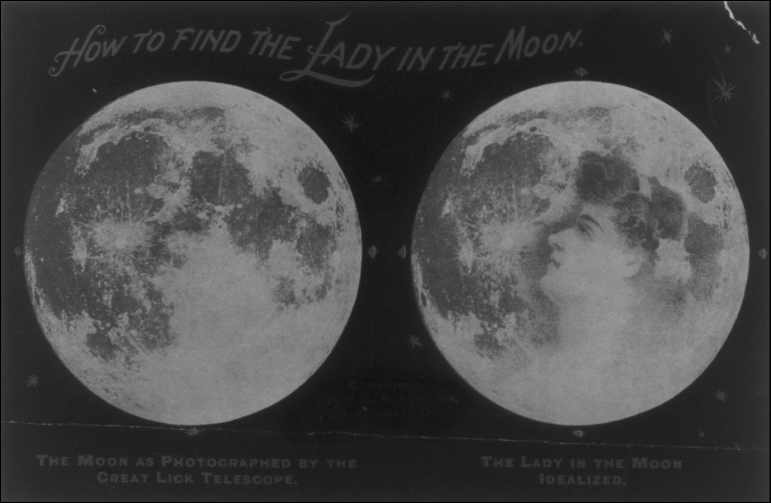 Kuva 3. Naisen profiili Kuussa, postikortti vuodelta 1894. Kuva: Krebs Lith. co. / Kongressin kirjasto.
