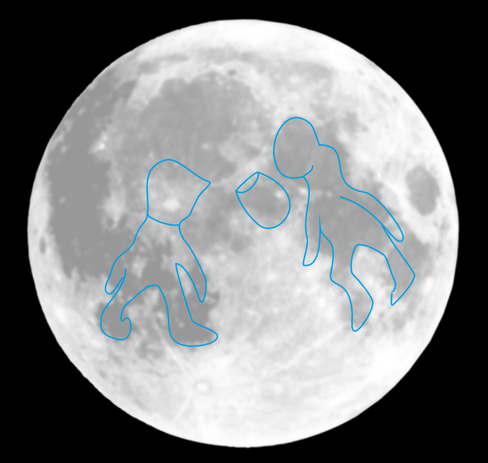 Mare Serenitatis ja Tranquillitatis (Rauhallisuuden meri) muodostavat naisen vartalon ja Mare Fecunditatis (Hedelmällisyyden meri) pään. Mare Crisium (Vaarojen meri) toimii vesikannuna.