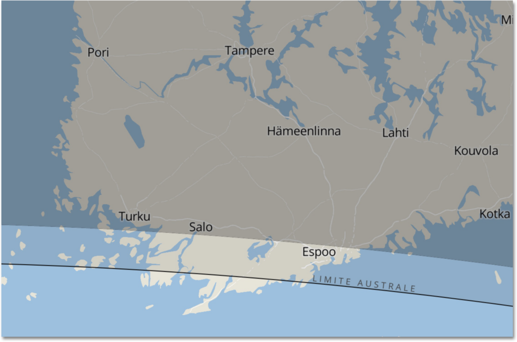 Kuva 13. Marsin peittyminen Suomessa. Vaaleammalla merkityllä alueella Mars peittyi Kuun taakse ainoastaan osittain, tummemmalla alueella kokonaan. Kuva: Formulaires de calcul d’éphémérides, IMCCE (https://ssp.imcce.fr).