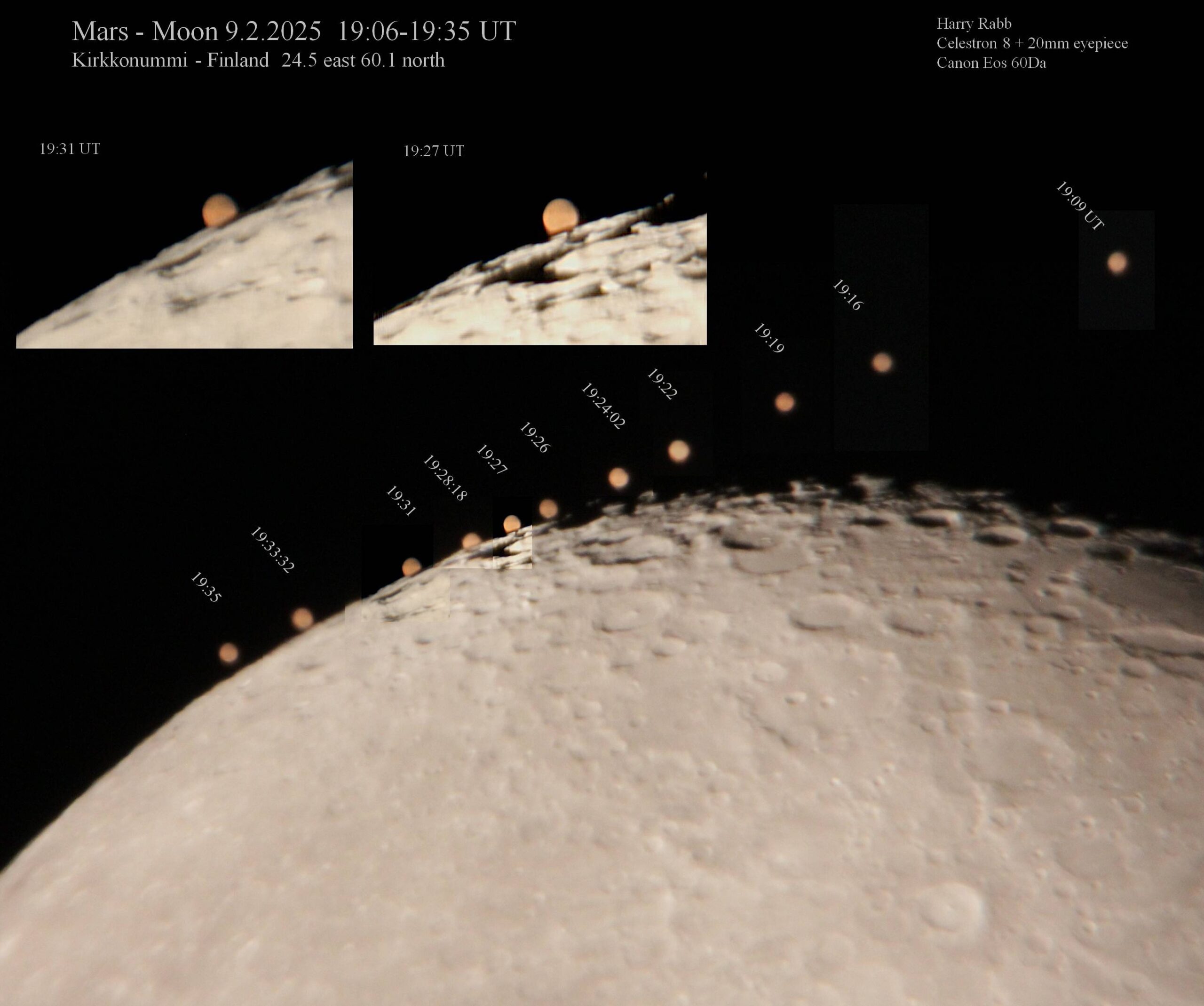 Kuva 14. Mars peittyi osittain Kuun taakse Kirkkonummella. Kellonajat ovat UT-muodossa eli kaksi tuntia Suomen aikavyöhykettä vähemmän. Etelä on ylhäällä. Celestron 8, okulaari 20 mm, kamera Canon EOS 60Da. Kuva: Harry Rabb.