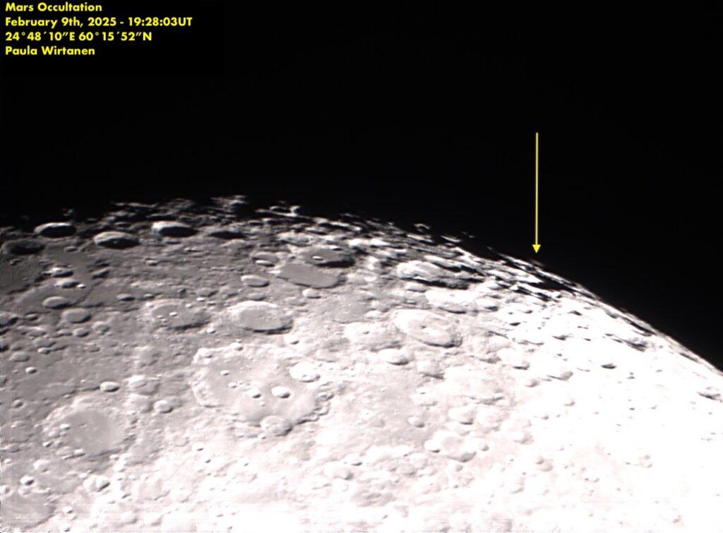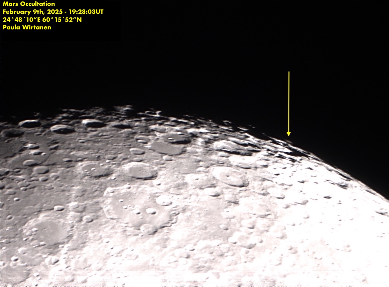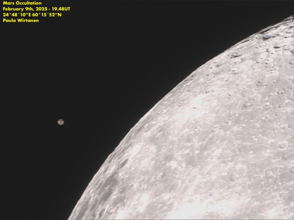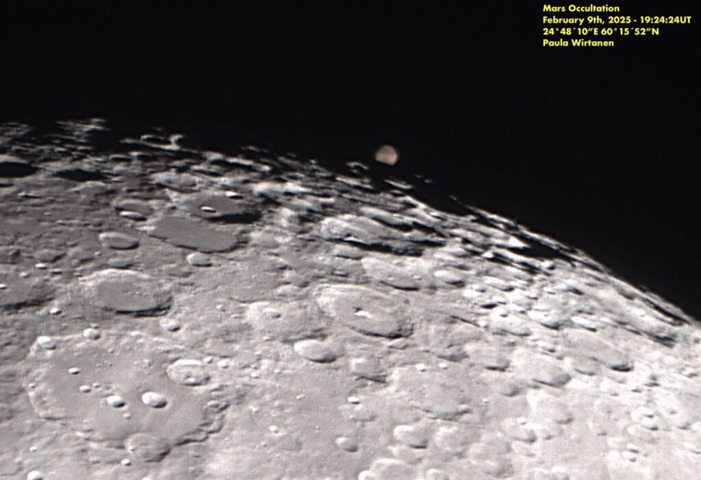 Helmikuun alussa oli jälleen kirkkaamman planeetan peittymisen vuoro. Tällöin vuorossa oli Mars, joka peittyi sunnuntai-iltana 9.2.2025. Kuusta oli valaistuna 92 %, joka toki häiritsi niinkin kirkkaan kohteen kuin Marsin näkymistä siinä vierellä.