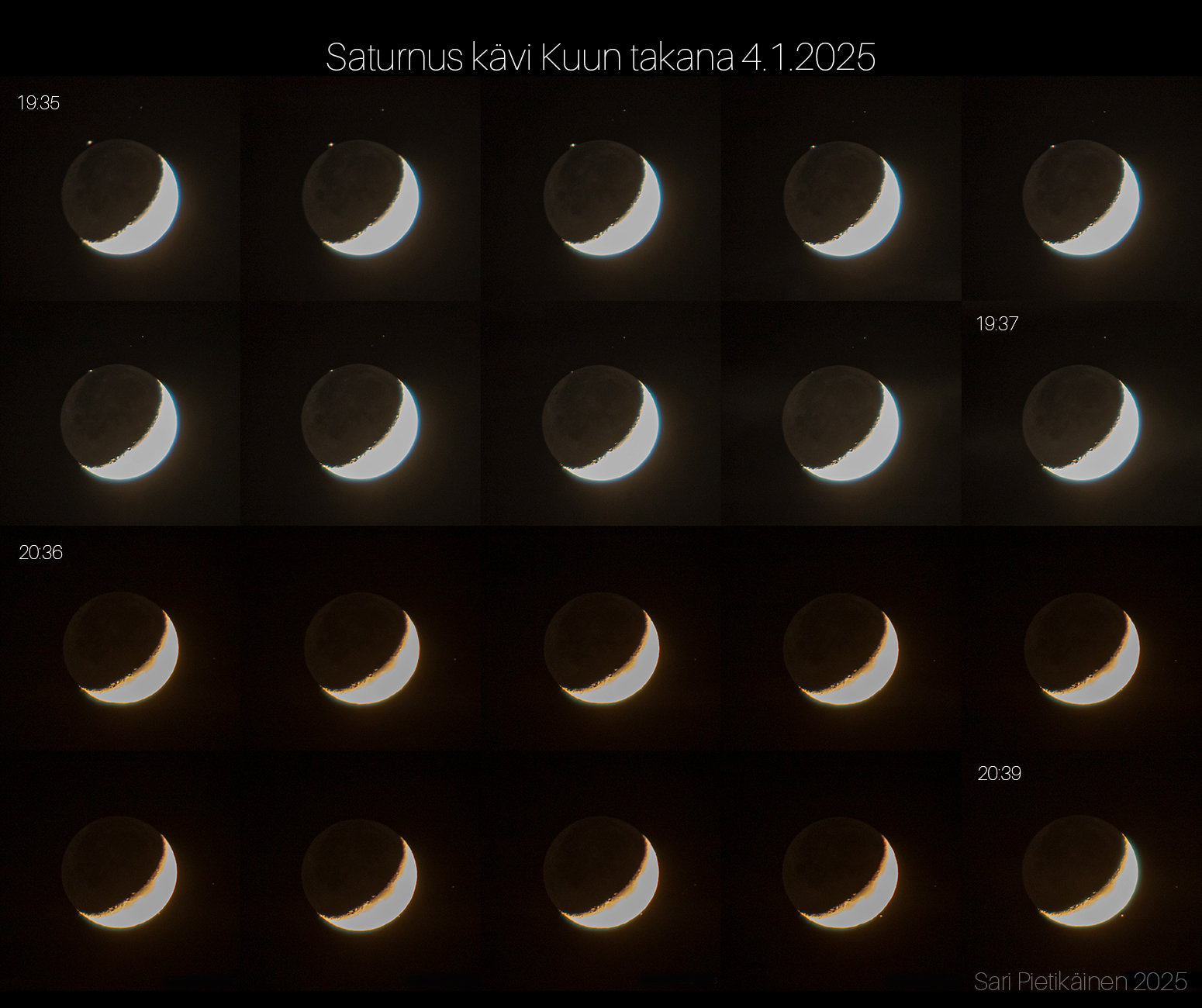”Ilta vaikutti umpipilviseltä, mutta kummallisesti pilvet olivat hävinneet noin puoli tuntia ennen Saturnuksen okkultaatiota. Onneksi olin jo vienyt kaukoputken parvekkeelle jäähtymään niin pystyin havaitsemaan ensimmäistä kertaa planeetan peittymistä Kuun taakse. <…> Saturnuksen esiintulo Kuun takaa jäi pilvien ja lumisateen taakse.”