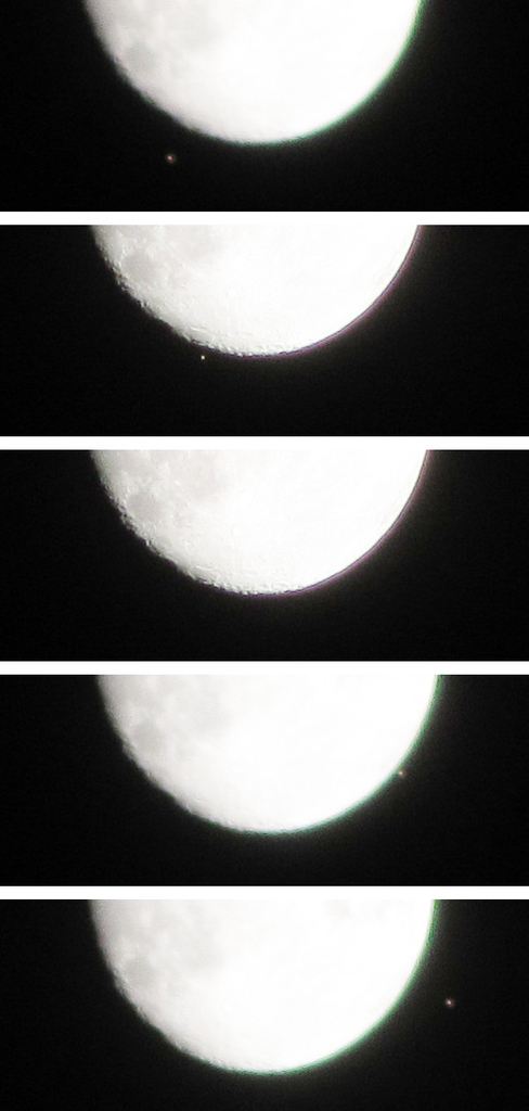 Mars kosketti Kuun reunaa kello 21.23. Marsin kulmaläpimitta peittymisen aikana 13 kaarisekuntia, eli siinä, missä Neptunus humpsahti Kuun kiekon taakse varsin nopeasti, sai Marsin peittymistä seurata kauemmin. Kokonaan Kuun reunan taakse Mars hävisi näkymättömiin kello 21.28 (kuva 16). Esiintuloa en saanut ajoitettua, vaan Kuu oli jättänyt Marsin jo reilusti taakseen saadessani kuvan (kuva 17).