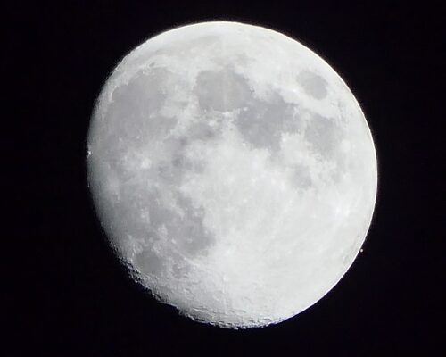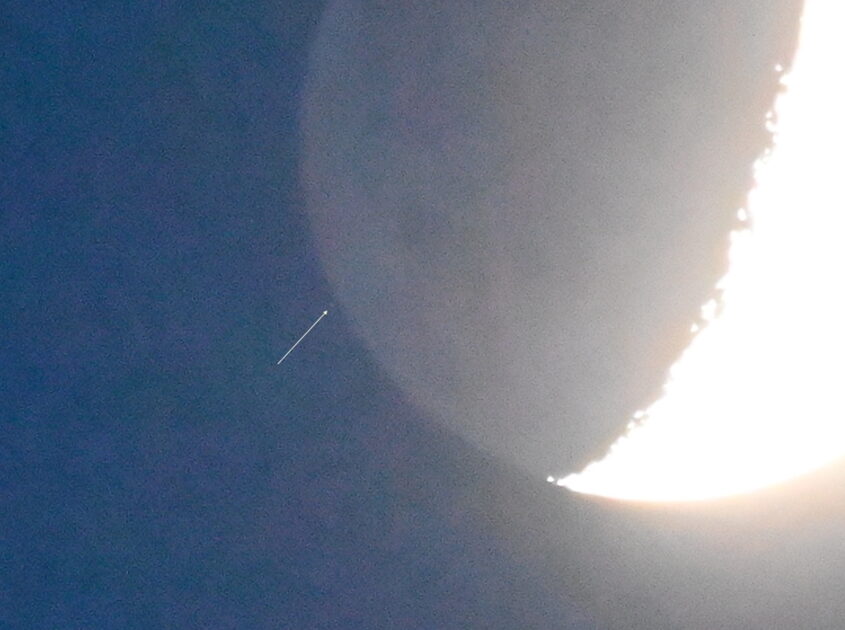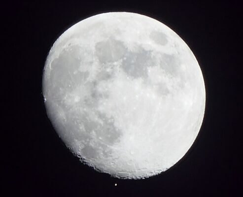 - Kuva 8. Neptunus peittymässä Kuun taakse Espoossa klo 16.38. Kamera: Nikon Z5, 600 mm, f/6,3, 1/80 s, ISO 51 200. Kuva: Markus Hotakainen.