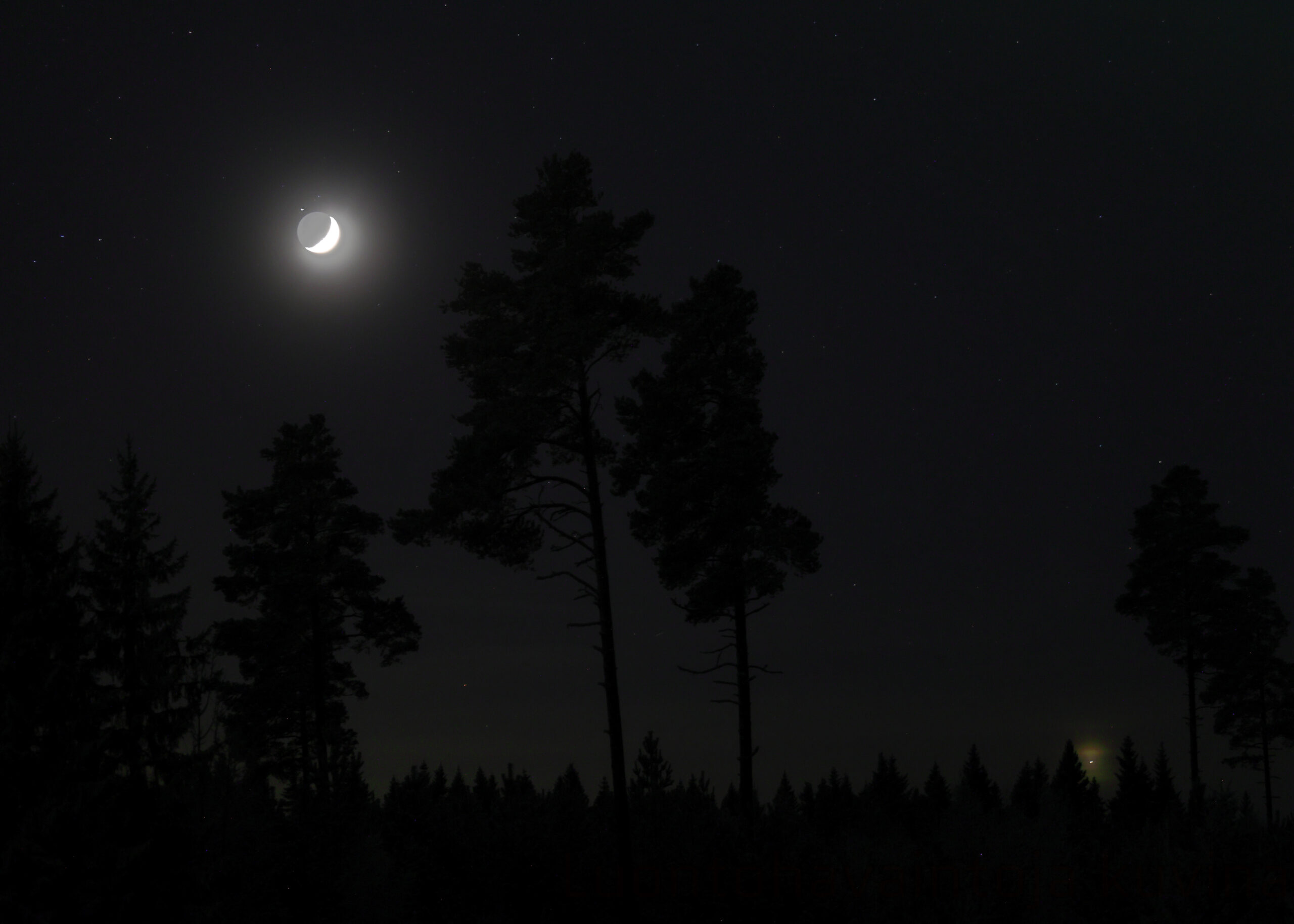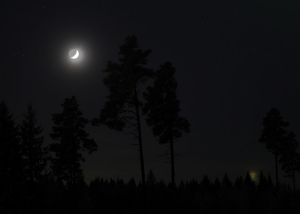 Kuva 2. Saturnus hetkeä ennen peittymistään Kuun taakse Raahessa 4.1.2025 klo 19.25. Metsän päällä kimmeltää Venus. Kamera: Canon EOS R5, 100 mm, f/2,8, 1 s, ISO 400. Kuva: Jarkko Alatalo.