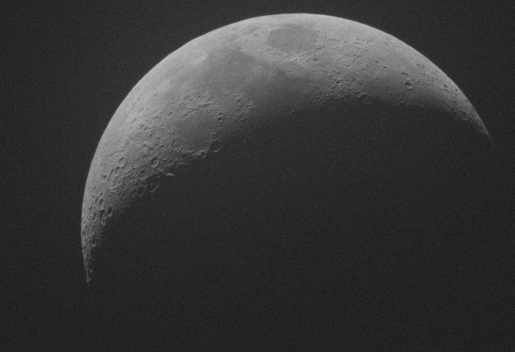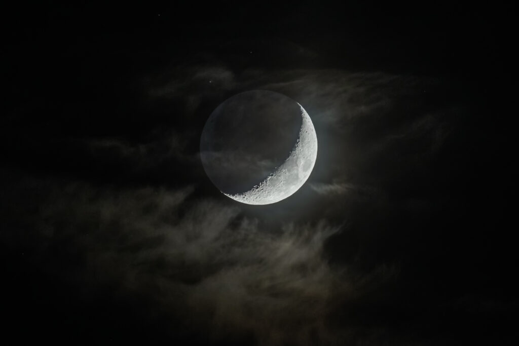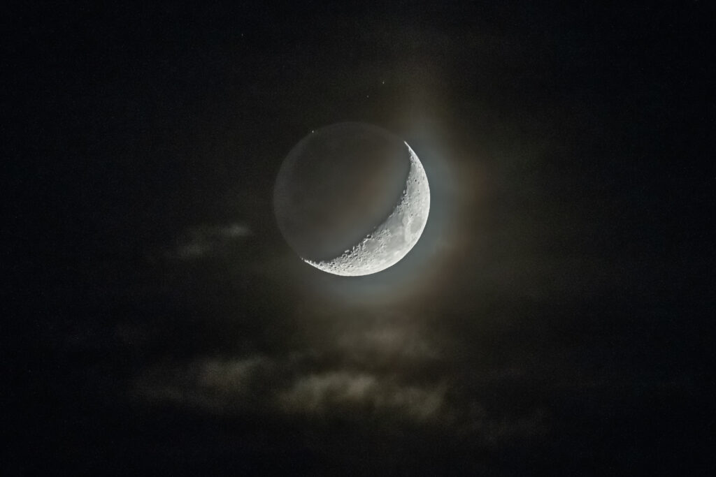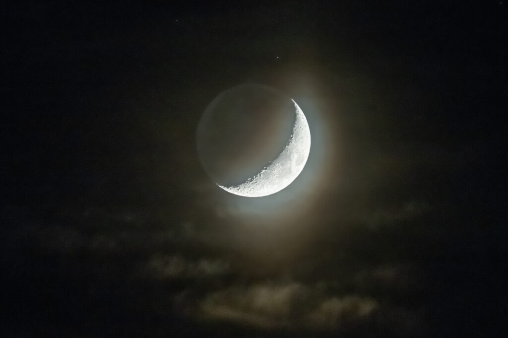 Kuva 4. Kuvasarja Saturnuksen peittymisestä Kuusamossa. Tässä klo 19.23 otetussa kuvassa Saturnus erottuu vielä selvästi kuunsirpin vierellä. Kamera: Nikon Z9, 600 mm, seitsemän kuvan HDR. Kuvat: Keijo Lehtimäki.