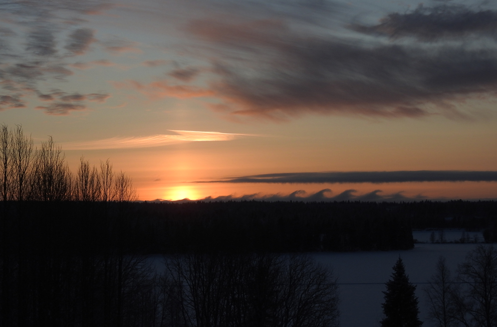 Nyt vihdoin sain sumukaaren kuvattua. Koko talven katsellut täällä kuvia ja miettinyt,että näinköhän kaaret osaa vältellä meikäläistä. Luultavasti olen vuosien aikana sen nähnytkin tai ainakin pätkiä. Olen vaan ihmetellyt,että jopas on jännä pilvi 😀 Monta kuvaa siksi kun sumu sakeni nopeasti ja sain erilaiset näkymät. Punertava sävy näkyi silmillä jonkun matkaa tuossa kaaren vasemmalla sivulla.Vähän kuvissakin. Sumu tosiaan levisi ympäriinsä,yli järven. Oli hetken ja katosi kokonaan.