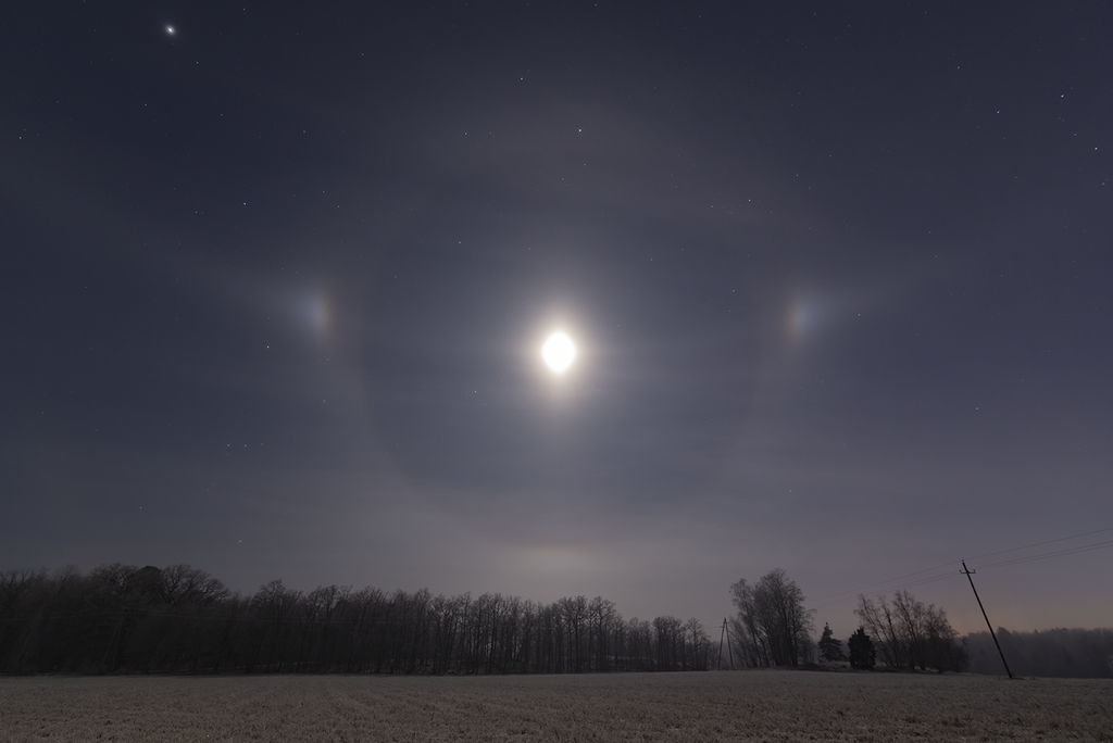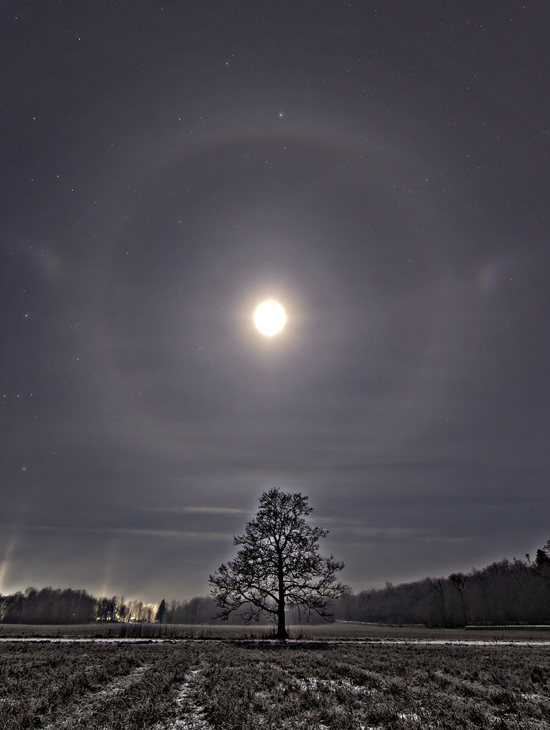Uusi vuosi alkoikin mukavissa merkeissä. Illan mittaan tuli seurattua mahdollista jääsumutilannetta nettikameroista ja lupaavaltahan tuo Ruissalon sunnassa näytti. Vuoden vaihduttua pääsin matkaan ja oletettua aluetta lähestyessä alkoikin erottua kiteiden kimallusta ajovaloissa. Pilven tihentyessä ajelin sopivasti kohdalla olleen pellon reunaan ja siellähän oli ihan kiva näytelmä käynnissä. Pääkuvassa yläreunasta lähestyy auto, joka tarjoili pilaria, “sivuajovaloja” ja aavistuksen 22° rengasta.