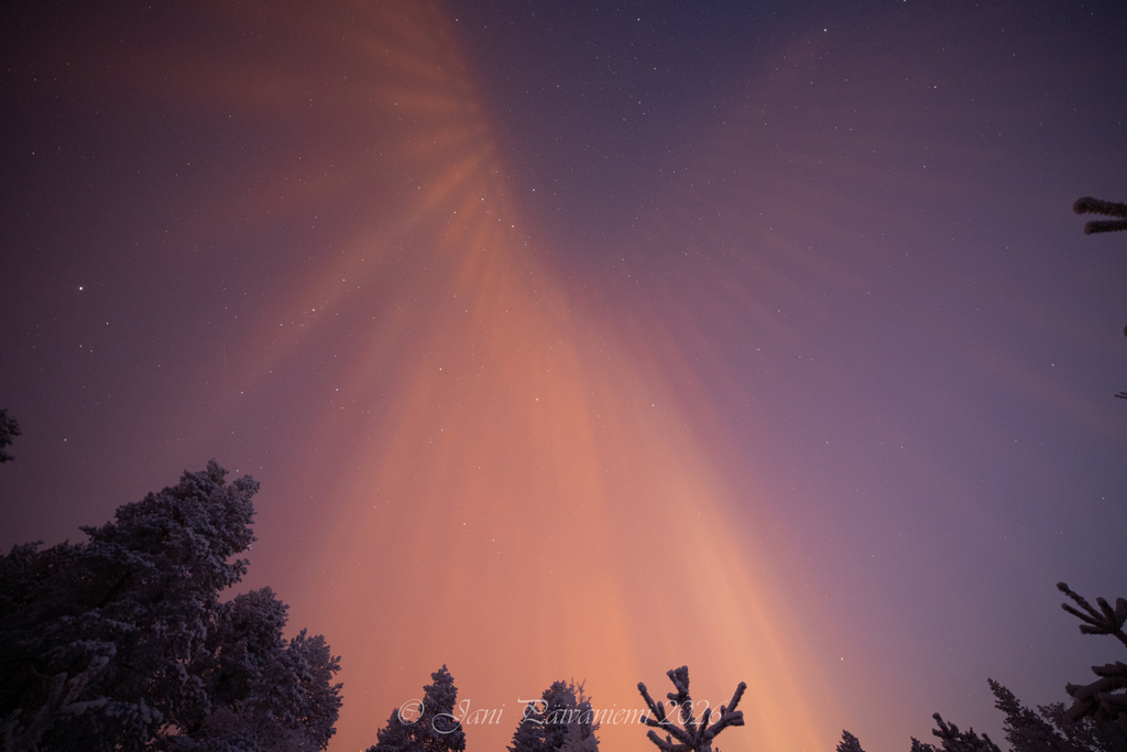 Kuusamossa näkyi myös kaunis keinovalopilarinäytös. Sen kuvasi Jani Päiväniemi 6.1.: