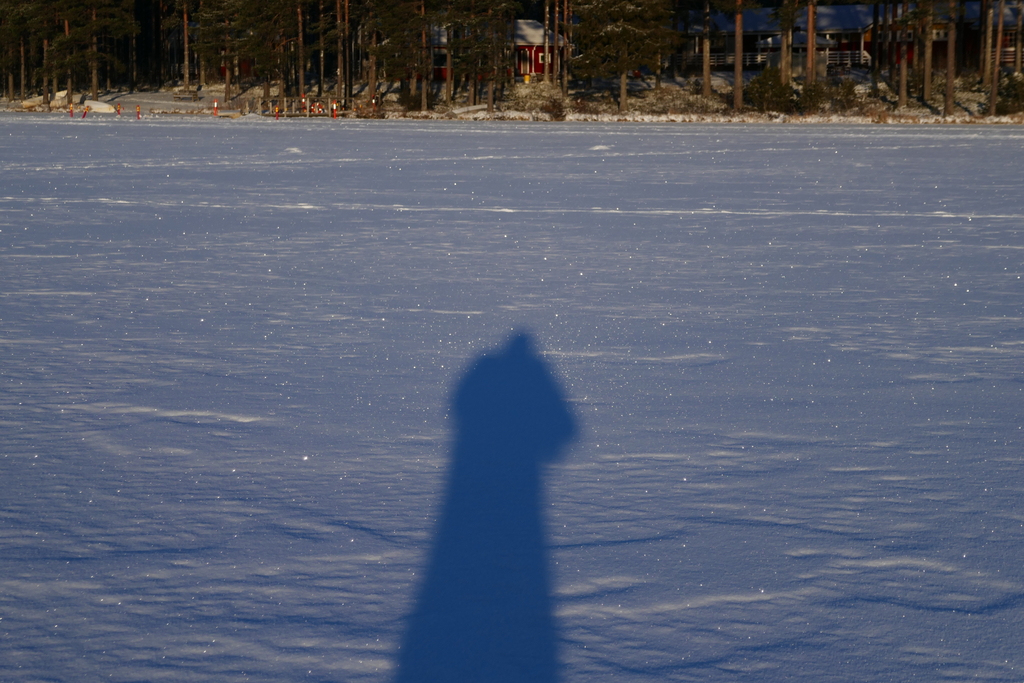 Huomasin myös, että lumihangessa oli valkoista kidevälkettä oman pääni varjon ympärillä enemmän kuin muualla. Aivan kuin pääni varjoa olisi ympäröinyt kidevälkkeestä muodostunut valokehä. Ehkä tämän voisi tulkita ala-vasta-auringoksi? Tätä oli hankala saada kunnolla kuviin, koska kidevälkkeiden paras keskittymä jäi aina oman varjon taakse piiloon.