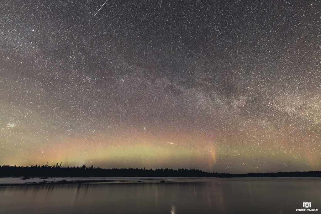 Keijo Lehtimäki ihaili Linnunrataa Kuusamossa 20.3. illalla. Mukaan tuli myös hennot revontulet sekä paljon satelliitteja:
