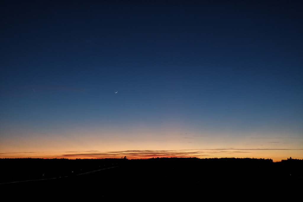 Kuu maatamoineen ja Venus kelluttelivat iltataivaalla havaitsijoiden viettäessä aikaa Kevolan observatorion ”zeniittitornissa”. Myös hämäränsäteet viipaloivat hetken taivasta