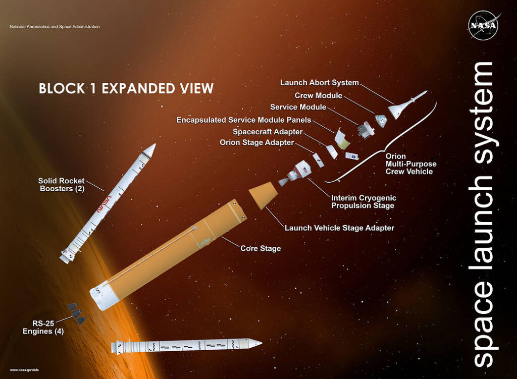 Space Launch System (SLS): Maailman tehokkain kantoraketti, joka lähettää Orion-aluksen suoraan kohti Kuuta. Sen runkovaihe hyödyntää päivitettyjä avaruussukkulan moottoreita.