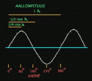 Sama vaihekäsite ilmenee myös siirtolinjassa (esim. koaksiaalikaapeli). Kaapelissa etenevän aaltoliikkeen aallonpituus = aallonpituus tyhjiössä * ko. kaapelityypin nopeuskerroin (l=wl*c, jossa 0,5<c<1). Aallonpituus (eli yksi jakso) olisi 100 MHz taajuudella koaksiaalikaapelissa n. 2 m pituinen kaapelin eristeaineen dielektrisyysvakiosta riippuen. Neljännes- ja puolenaallon mittaisilla kaapeleilla voidaan synnyttää erivaiheisia signaaleita esim. antennirykelmän eri syöttöelementeille ja siten muokata antennista saatavan säteilyn polarisaatiota, tai suuntautuvuutta. Esimerkkinä ns. ympyräpolarisaation aikaansaaminen kahdella ristikkäisellä lineaarisen polarisaation elementillä, jossa syöttökaapelin vaiheistuksessa toisen polarisaation syöttöelementin syöttöjohdossa on sarjassa ylimääräinen neljäsosa-aallon pätkä koaksiaalikaapelia, jolla on aikaansaatu tarvittava 90° vaiheensiirto elementtien syötön välille. Vastaava vaihe ero voitaisiin myös aikaansaada siirtämällä toista syöttöelementtiä signaalin tulosuunnassa neljännesaallon (tässä: aallonpituus tyhjiössä) verran eteen, tai taaksepäin, joiden erona olisi polarisaation pyörimissuunnan käteisyys.