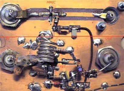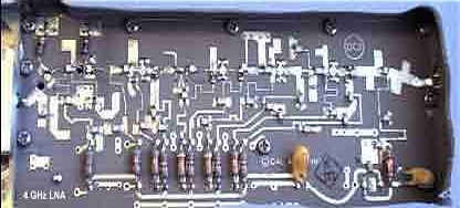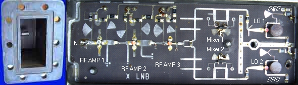 Aaltojohdon perällä (kuvassa vasemmalla) on kytkentäelin (probe) 1. RF-asteelle. Kuvassa oikealla on strip-line-tekniikalla ja pintaliitoskomponenteilla toteutettu 11 GHz HEMT-LNB konvertteri. Vasemmalta oikealle: kolme RF-vahvistinastetta, jakaja-hybridiä seuraavat kaistanpäästösuodin ylemmälle ja alemalle taajuuskaistalle, rengas-sekoittimet ja oikeassa reunassa 9...10 GHz taajuuksilla värähtelevät dielektriset oskillaattorit (DROt) (LO1 ja LO2). Vastaanottotaajuuskaista vaihdetaan kytkemällä päälle joko LO1, tai LO2 ja valitsemalla ko. taajuuskaistan sekoittajan välitaajuuslähtö (IF). Kuvassa ei näy absorboivaa (hiiltä sisältävä resistiivinen massa) väliseinämaä keskellä vahvistinketjua mm. vaimentaa metallikotelossa syntyviä haitallisia mikroaaltotaajuisia resonansseja, jotka voisivat johtaa RF-vahvistinasteiden itsevärähtelyyn. Painoiirilevymateriaali on usein mikroaalloilla teflon (PTFE)-pohjainen sen vähähäviöisyyden takia.