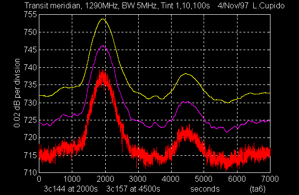 L. Cupido, CT1DMK on mitannut 1,29 GHz:llä 5,6-metrisellä peiliantennilla M1:stä, joka on yksi luotettavimmista ja voimakkaimmista kalibrointikohteista taivaalla (875 Jy 1,4 GHz:lla). Toinen piikki käyrässä on supernovajäänne 3C157. Puhtaimman käyrän (kelt.) mittausta on integroitu 100 sekunnin aikavakiolla ja kohinaisimmassa aikavakio on ollut vain sekunti. Kuten voi arvata, vasemmalla oleva y-akselin asteikko, joka alkaa 710..., ei ole mitään yksikköä, vaan on relatiivinen, luultavasti A/D-muuntimen antama lukuarvo. Kuitenkin sen jakovälit on saatu selvitettyä (0,02 dB/jakoväli).