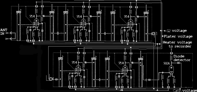 Grote Reberin vuonna 1938 paraboliantennin syöttöpisteessä sijainneen 160 MHz vastaanottimen piirikaavio olisi voinut olla suunnilleen tämänkaltainen.