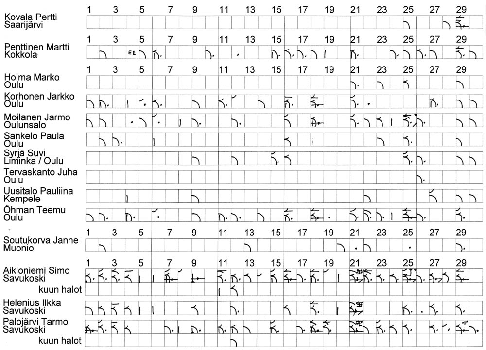 | Kirjaintunnusten selitykset a) 22° rengas b) auringonpilari c) sivuauringot d) 22° sivuavat kaaret e) 46° rengas f) zeniitinympäristön kaari g) 46° ylläsivuava kaari h) 46° allasivuavat kaaret i) horisonttirengas j) ala-aurinko k) Parryn kaari m) yläkupera Parryn kaari n) Lowitzin kaaret o) Wegenerin vasta-aurinkokaaret p) 120° sivuauringot q) vasta-aurinko (Greenlerin vasta-aurinkokaaret) r ja s) ellipsihalot, niin monta E-merkkiä kuin erikokoisia ellipsejä näkyvissä. | Numerotunnusten selitykset 1) 9° rengas (van Buijsenin halo) 2) 18° rengas (Rankinin halo) 3) 20° rengas (Burneyn halo) 4) 23° rengas (Barkowin halo) 5) 24° rengas (Dutheilin halo) 6) 35° rengas (Feuilléen halo) 7) 9° parheliat (parroidit) 8) 18° parheliat (parroidit) 9) 23° parheliat (parroidit) 10) 24° parheliat (parroidit) 11) 9° sivuavat kaaret Pyramidihalojen runsauden vuoksi on tällainen esittämistapa hiukan hankala kun koodaustaulukon ruudut ovat melkoisen pieniä. Esimerkiksi 9° sivuavien selvä esittäminen on siksi hankalaa että tässä on käytetty pystyviivaa vaikka muissa koodaustaulukoissa se on esitetty hiukan toisella tavalla. |