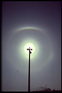 6.5.-93 Joensuun hieno pyramidihalonäytelmä. Kuvat Marko Riikonen. Erikoisista pyramidin muotoisista jääkiteistä aiheutuvien harvinaisten aurinkokeskisten renkaiden näytelmiä havaitaan muutamia vuodessa. Tässä näytelmässä nuo normaalisti varsin himmeät ja diffuusit halot olivat poikkeuksellisen kirkkaita ja hyvin kehittyneitä. Näytelmän maksimin aikaan taivaalla oli yhteensä 7 aurinkokeskistä rengasta tavanomaiset 22 ja 46 asteen renkaat mukaanlukien. Renkaiden yhteydessä näkyvät kirkastumat ovat merkkejä ns. pyramidirenkaita sivuavista kaarista, jotka syntyvät, kun kide ei enää ole täysin satunnaisissa asennoissa vaan jokin tietty liikeasento on todennäköisempi kuin toinen.