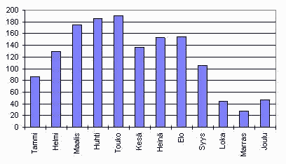 Ohessa on jaoston viime vuosi myös grafiikkana. Pylväskaavio (Fig. 1) esittää havaintoja per kuukausi. Toukokuu kohoaa korkeimmalle. Toukokuussa tehtiin 191 havaintoa ja huhtikuussa 186. Marraskuun pylväs yltää vaivoin 28 havainnon korkeudelle. Mielenkiintoinen seikka on se, että jokaiselle kuukaudelle löytyi vähintään 11 havaitsijaa ja huhtikuussa havaitsijoita oli peräti 20 henkeä. Kesäkuun kolo näkyy myös havaitsijamäärissä, sillä kesäkuussa havaintoja tuli 13:lta havaitsijalta, kun kuukautta aikaisemmin havaitsijoita oli 18 ja kuukautta myöhemmin 17.