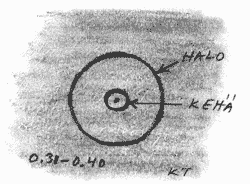 Klo 19.50-20.15 sarjassa (Fig. 12c-e) näkyy valolähteen korkeuden muutoksen vaikutus haloihin. Keskimmäisessä, valolähteen ollessa noin 50° korkeudessa näkyvät viuhkat ylös ja alas lampusta ovat itseasiassa zeniitin- ja horisontinympäristön kaaret (Fig. 12d). Keinovaloilla halomuoto voi näkyä auringolta tuttujen teoreettisen esiintymisrajoja uhmaten. Tämä piirros on osoitus tästä, sillä normaalistihan zyk näkyy kun aurinkon korkeus < 32° ja hyk näkyy kun aurinko on yli 58° korkeudella. Tämä jälleen johtuu valolähteen rajallisesta etäisyydestä, josta johtuu puolestaan se, ettei valonsäteet ole yhdensuuntaisia kuten auringon tai kuun tapauksessa.