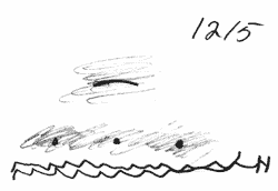 Karla sai joulukuulta viisi havaintoa, joista kolme Kuulta. Saalis oli varsin tavanomaista tarjontaa. Mitään erikoisempaa ei Karlankaan silmiin sattunut vuoden viimeisen kuukauden aikana. Ohessa Karlan piirros Rantsilassa 27.12.2001 linja-autosta käsin nähdystä näytelmästä (Fig. 11).