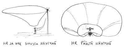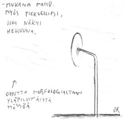 Teemun keinovalohavainto 7-8.2.2001 välisenä yönä on varsin mielenkiintoinen (Fig. 14a-b). Miehellä oli tilaisuus saada lamppu horisontin alapuolelle. Tällöin seurauksena on horisontin alapuolisten halojen siirtyminen horisontin yläpuolelle. Keinovaloilla tämä tilanne on herkullinen, sillä horisontin alapuoliset halot usein hukkuvat lumihankia ja lähellä sijaitsevaa maata vasten varsin tehokkaasti. Näytelmässä oli mukana vain pilari, sivulamput, yläsivulamput ja alasivulamput. Teemun piirroksessa on näiden lisäksi lenkki sivulampusta toiseen horisontin kautta, joka liittyy sivulamppuihin. Omat aivoni, vaikka melko kierossa valmiiksi ovatkin, eivät onnistuneet tuota vääntämään ymmärrykseen asti, mutta pitäydyn toistaiseksi Teemun havainnossa ja kommentissa. Teemun ensimmäisessä piirroksessa näkyy alasivulamput (1) horisontin yläpuolella pitkinä pötköinä eikä suinkaan yläsivulamppujen (2), jotka näkyvät toisessa piirroksessa, näköisinä. Tämä pitää yhtä teorioiden kanssa.