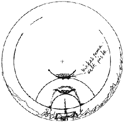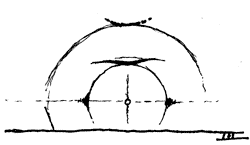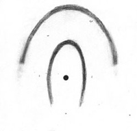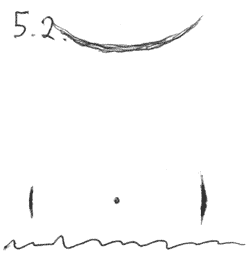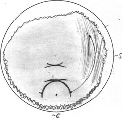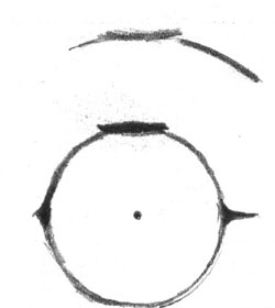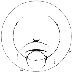 Renkaan etäisyyttä on vaikea mitata, mutta se jää 23° ylemmän parhelian alle lakipisteessään ja on siten vähintään yhtä kaukana kuin 23° ylempi parhelia eli noin 28° päässä auringosta. Tämä mahdollinen 28° rengas on eräissä dioissa aika selvä. Oheiseen klo 00.14 näkynyttä rengasmaksimia (parhelioilla oli maksimi klo 00.44) kuvaavaan piirrokseen olen piirtänyt tämänkin renkaan mukaan niin kuin se kuvassa näyttäisi sijaitsevan (Fig. 1).