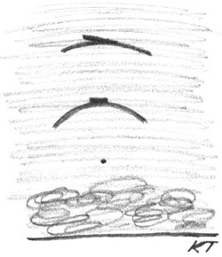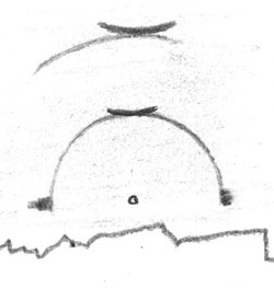 Pääkaupunkiseudulla vaikuttava Jorma näki lähinnä tavan haloja helmi- ja maaliskuussa. Hiukan poikkeavasti Jormalla maaliskuu hävisi neljällä havainnollaan helmikuun kuudelle havainnolle. Ohessa mallipiirros 30.3.2001 Helsingin Herttoniemessä näkyneestä auringonpilarista (Fig. 4).