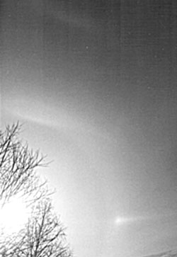 Vanha parta eli Ruoskasen Jukka lähetti pitkästä aikaan havaintoja enemmänkin. Tammikuussa saaliiksi jäin vaivainen kuun pilari, mutta helmikuussa havaintoja kertyi sitten 15 päivältä (13) tai yöltä (2). Kuun kohokohdaksi tuli 5.2.2001 Riihimäellä näkynyt komea zeniitinympäristön kaari (Fig. 12): "ZYK oli upean pitkä. Ei väreiltään eikä kirkkaudeltaan järkyttävä, mutta pituus oli kyllä hämmästyttävä (Aurinko matalalla)."