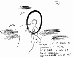 Allarin joulukuun havaintolomakkeella on havainto marraskuulta?.. No, tammikuun lomakkeella on sitten kolme havaintoa, joista viimeiseen 27:nen päivän havaintoon liittyvä piirros kertoo havainnon oleva helmikuun lopulta. Helmikuun lomakkeen neljän havainnon joukossa kyseistä havaintoa ei kuitenkaan ole, joten oletan sen olevan tammikuun lopun havainto eli ohessa 27.1.2002 Jämsän Himoksessa tehty havainto (Fig. 14). Hiukan tsemppiä Allar! Lomakkeiden päiväys-sarakkeeseen on syytä kirjoittaa päiväys kuukausi mukaan lukien (esim. 27.2.).