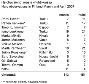 Näin on jälleen yksi halohuhtikuu takana. On aika avata pussi väkevää salmiakkia ja kaivaa jaoston sähköpostista ja havaintomapista saapuneet havaintoraportit. Kaksitoista havaitsijaa muisti jaostoa yhteensä 249 maalis–huhtikuun halohavainnolla. Ei paha, ei paha. Lisäksi vastoin viimekertaista uhkaustani kävin läpi ilmakeha-l -listan postit ja poimin sieltä mukaan tapaukset, joista en varsinaista raporttia saanut. Siispä ilman suurempia sepustuksia asiaan. Ensin raportin lähettäneet tällä kertaa öökkösellisessä järjestyksessä ja tämän jälkeen tarkempi katselmus muutamaan erityiseen päivämäärään.