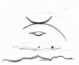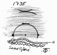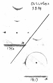 Fig 20 (left): 13rd April 1999 in Juva. Infralateral arc and full parhelic circle observed by Jari Piikki. Halo in the top of drawing is supralateral arc. Fig 21 (right): 19th Sep 1999 in Juva. Jari Piikki's observation where you can see a small fragment of parhelic circle just inside right parhelion.
