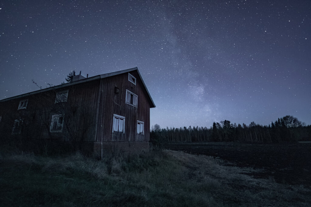 Lopulta tuuli äityi hurjaksi ja Kaivolan tien liikenne jostain syystä myös, kuvaamisesta pohjoiseen eli tien suuntaan tuli aika mahdotonta. Tein päätöksen lähteä takaisin tilalle vaikka kuusiaidan vierestä kulkeminen oli aika pelottavaa tapahtuneen jälkeen. Jätin jalustan käteeni varmuuden vuoksi. Ajatus siitä, että joutuisin hutkimaan supikoiraa kallilla jalustalla tuntui huonolta idealta jota vakuutus ei korvaisi, mutta vaihtoehtoja ei ollut. Kättä pidempää oli tilanteessa oltava. Niinpä kävelin takaisin tilalle jalusta lyömäaseena. Ja kas, mitään ei tapahtunut. Ei kuulunut murinaa ja mitään ei näkynyt missään. Tilanne oli onnellisesti ohi. Ajattelin yrittää rentoutua ja ottaa vielä muutamat Linnunratakuvat ja lähteä kuvien jälkeen ajelemaan kotiin päin, koska hoksasin, että meillä Salonkylässä olisi ehkä paikka, jossa ilkeän tuulen saisi vältettyä. Olin ottamassa Linnunratakuvaa, kun pikemminkin ensimmäisenä aistin liikettä autiotilan vieressä takanani olevalla hakkuuaukealla. Sitten korviini kantautui tuttu, matala murina. Ei hyvän tähden voi olla totta. Otsalampun valo paljasti supikoiran, joka oli pimeässä hiippaillut taakseni noin viidentoista metrin päähän ja vaani siellä muina supikoirina. Huudolla tai räyhäämisellä ei ollut enää mitään vaikutusta, supikoira ja sen kavaltavat hehkuvat silmät vaihtoivat vähän paikkaa hiipien lähemmäs. Siinä kohtaa jännitys riitti. Kävelin rivakasti autolle otsavalon täydessä tehossa, työnsin kuvaustavarat autoon ja hyppäsin itse perään. En halunnut ottaa uusintamatsia supikoiran kanssa, koska terveys on tärkeämpi kuin kuvat. Aina. Ja tällä yksilöllä ei todellakaan tainnut olla kaikki kunnossa. Ensimmäisen kerran elämässäni oli pakko luovuttaa eläimen oudon käytöksen vuoksi ja vetäytyä pois alueelta.
