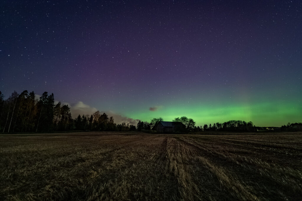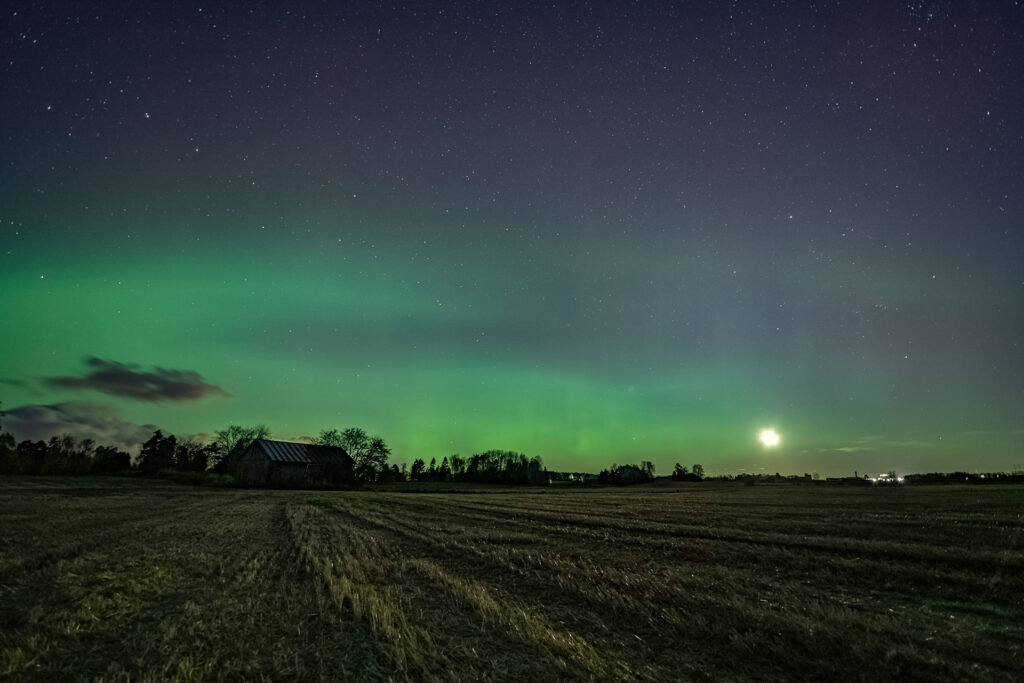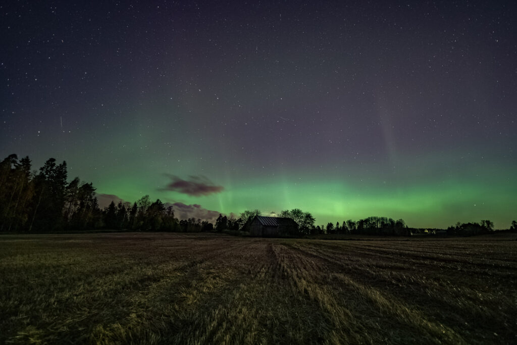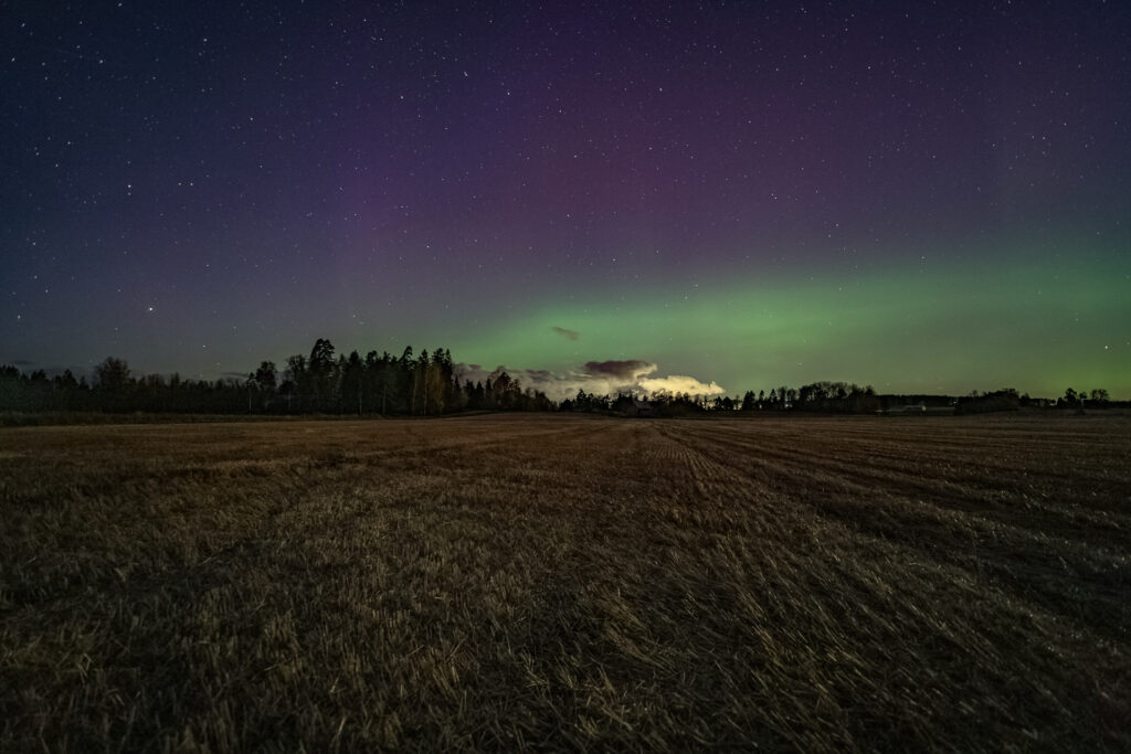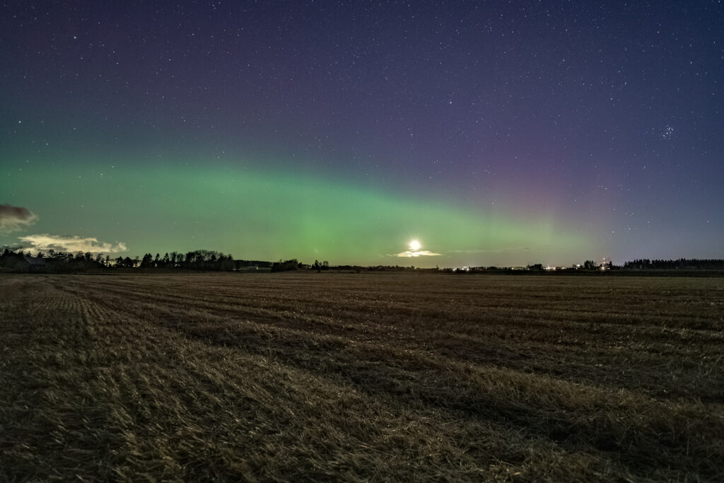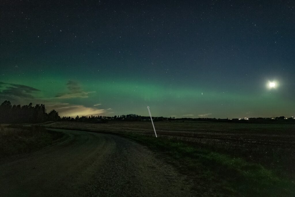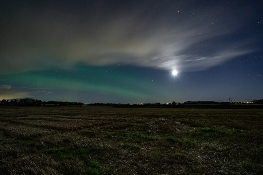 Jäin seisomaan sydän hakaten. Mitä ihmettä äsken tapahtui? Jos tuo raadonsyöjä olisi saanut purtua minua, ei tarvitsisi lähteä leikkaukseen ja kuukausien antibioottihoidot olisivat edessä. Ymmärsin, miten vaarallinen syntynyt tilanne oli ollut. Tunsin, miten päähineiden sisällä hikipisarat tekivät tuloaan. Samassa myös revontulet alkoivat aktivoitua, joten rynnistin pellon laitaan aistit hyvin valppaina edelleen ääneen noituen. Nyt ei oikein hommat suju. Sen verran tilanne kummitteli mielessäni, että kävelin pelloille vähän pidemmälle, mitä alkuun ajattelin, pois tapahtumapaikalta. Kuvasin ensimmäisen, hennon ja kauniin revontulinäytelmän Kuun jo noustessa. Revontulien jälkeen ajattelin ottaa Linnunratakuvan myös, ennenkuin Kuu valaisisi taivasta kadottaen Linnunradan yksityiskohdat. En pystynyt keskittymään kuvaamiseen käytännössä yhtään, vaan vilkuilin taakseni, eteen ja sivulle. Otsalampun sammuttaminen kuvanoton ajaksi ja pimeyteen jääminen oli liian iso kynnys. Pienikin rapsahdus maastosta niin sydän lähti laukalle ja otsavalo meni päälle. Ajattelin, että kaiken järjen mukaan supikoira on todennäköisesti jo seuraavassa läänissä, ei se enää hyökkäisi. Vai olisiko se kuitenkin mahdollista? En kertakaikkiaan tiennyt mitään varmaksi, en ole asiantuntija.