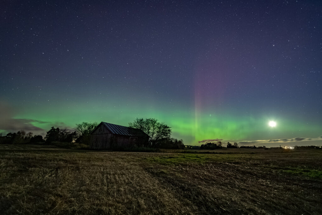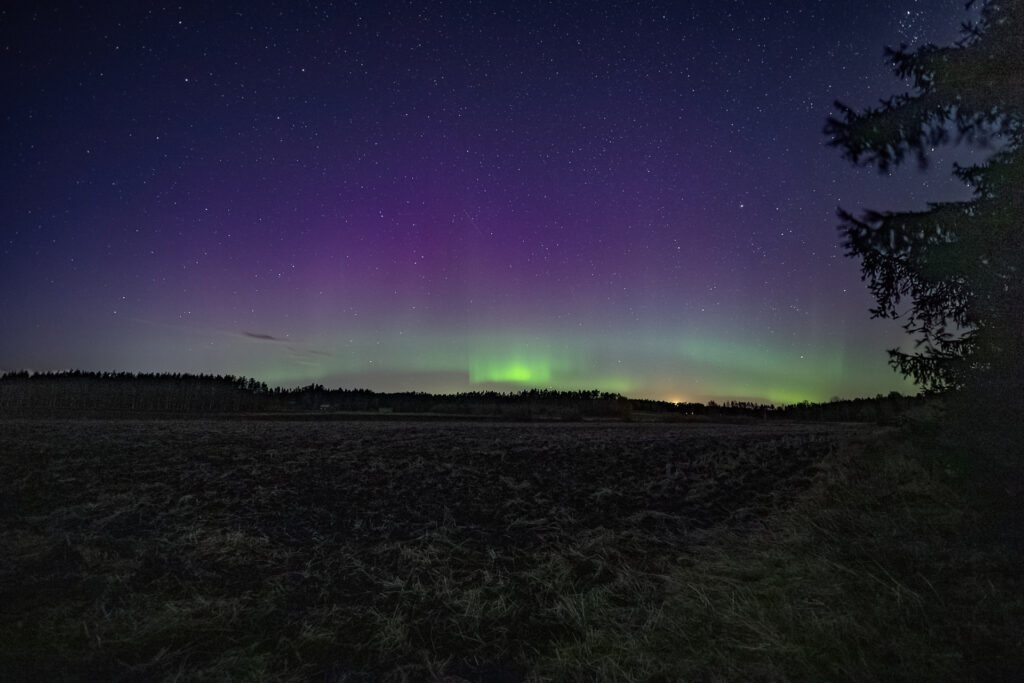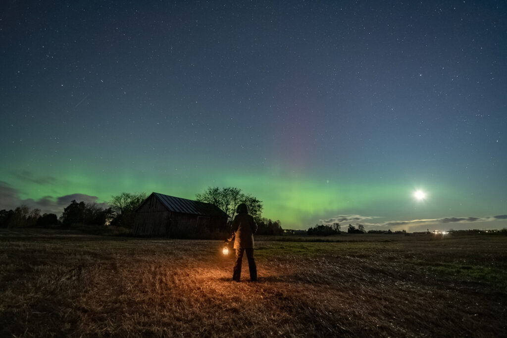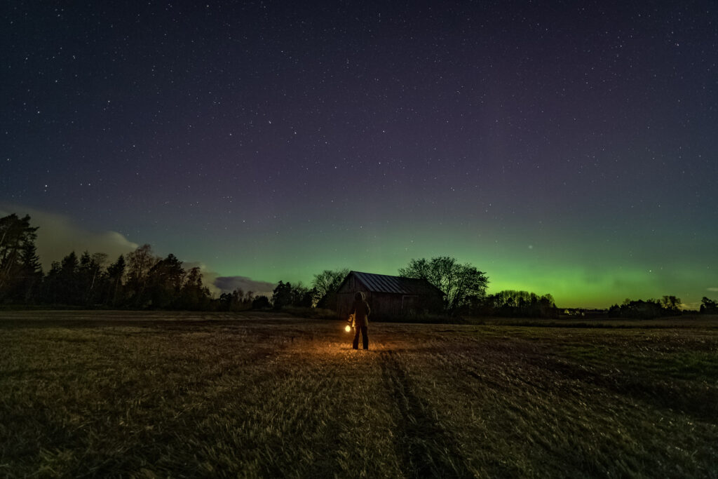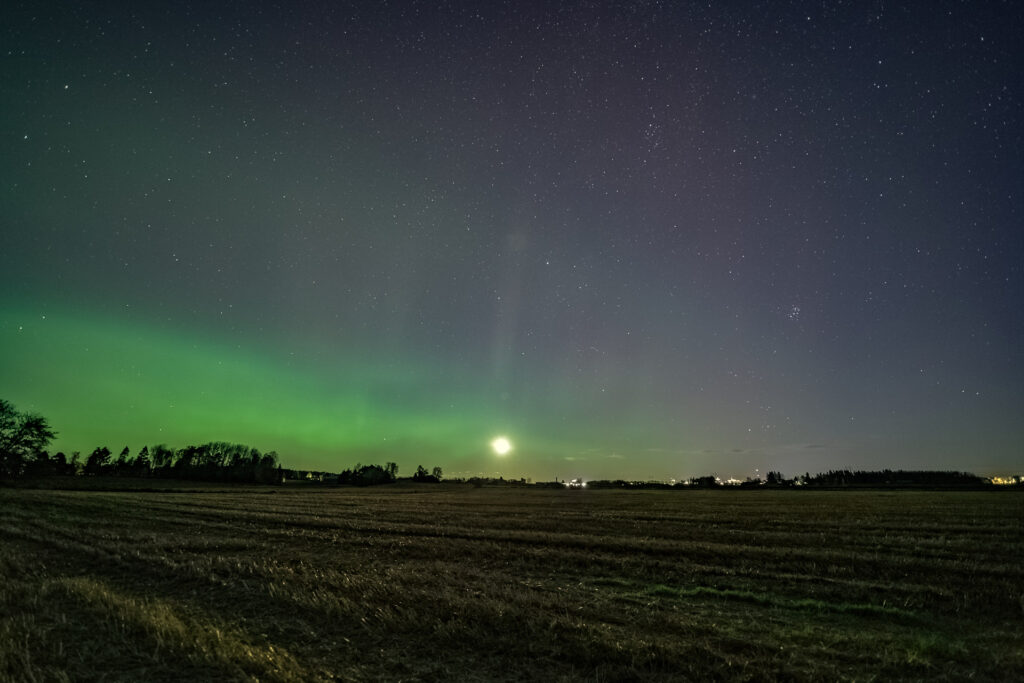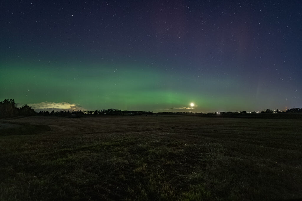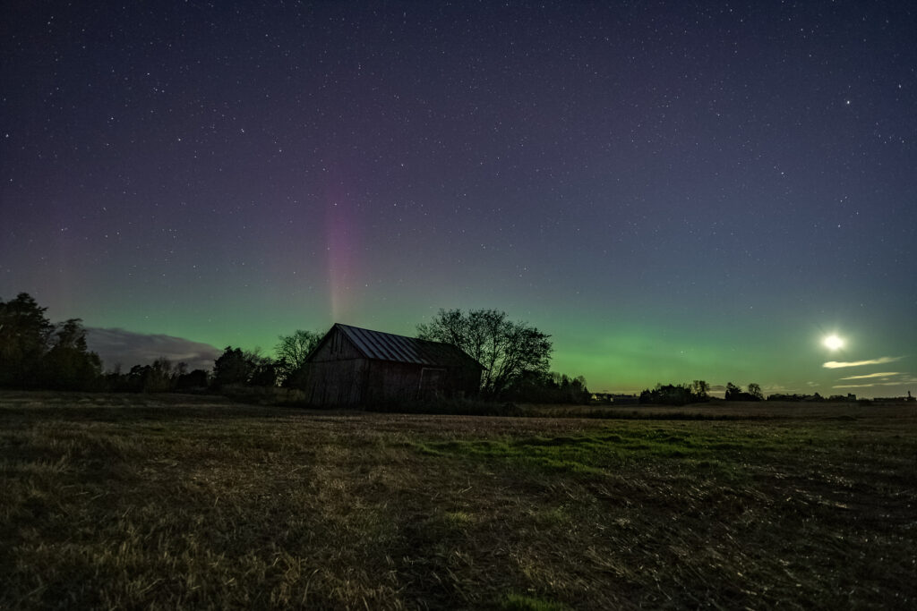 Jäin seisomaan sydän hakaten. Mitä ihmettä äsken tapahtui? Jos tuo raadonsyöjä olisi saanut purtua minua, ei tarvitsisi lähteä leikkaukseen ja kuukausien antibioottihoidot olisivat edessä. Ymmärsin, miten vaarallinen syntynyt tilanne oli ollut. Tunsin, miten päähineiden sisällä hikipisarat tekivät tuloaan. Samassa myös revontulet alkoivat aktivoitua, joten rynnistin pellon laitaan aistit hyvin valppaina edelleen ääneen noituen. Nyt ei oikein hommat suju. Sen verran tilanne kummitteli mielessäni, että kävelin pelloille vähän pidemmälle, mitä alkuun ajattelin, pois tapahtumapaikalta. Kuvasin ensimmäisen, hennon ja kauniin revontulinäytelmän Kuun jo noustessa. Revontulien jälkeen ajattelin ottaa Linnunratakuvan myös, ennenkuin Kuu valaisisi taivasta kadottaen Linnunradan yksityiskohdat. En pystynyt keskittymään kuvaamiseen käytännössä yhtään, vaan vilkuilin taakseni, eteen ja sivulle. Otsalampun sammuttaminen kuvanoton ajaksi ja pimeyteen jääminen oli liian iso kynnys. Pienikin rapsahdus maastosta niin sydän lähti laukalle ja otsavalo meni päälle. Ajattelin, että kaiken järjen mukaan supikoira on todennäköisesti jo seuraavassa läänissä, ei se enää hyökkäisi. Vai olisiko se kuitenkin mahdollista? En kertakaikkiaan tiennyt mitään varmaksi, en ole asiantuntija.