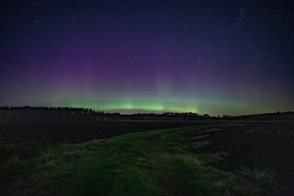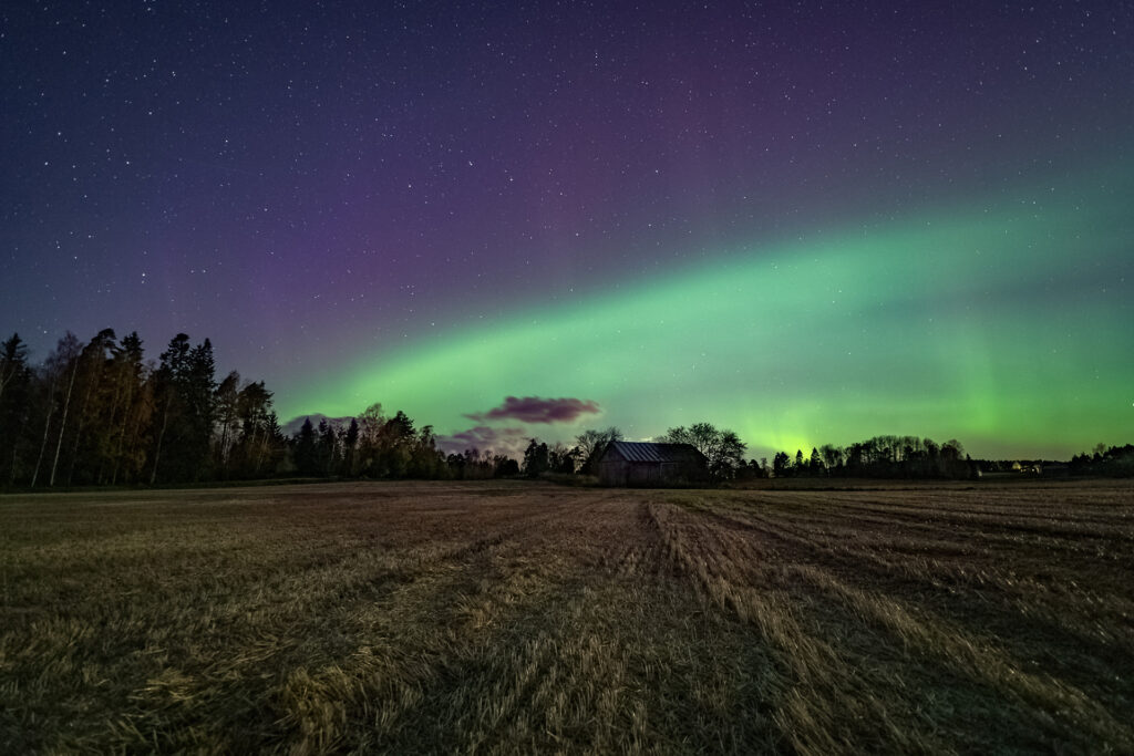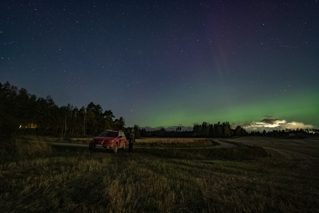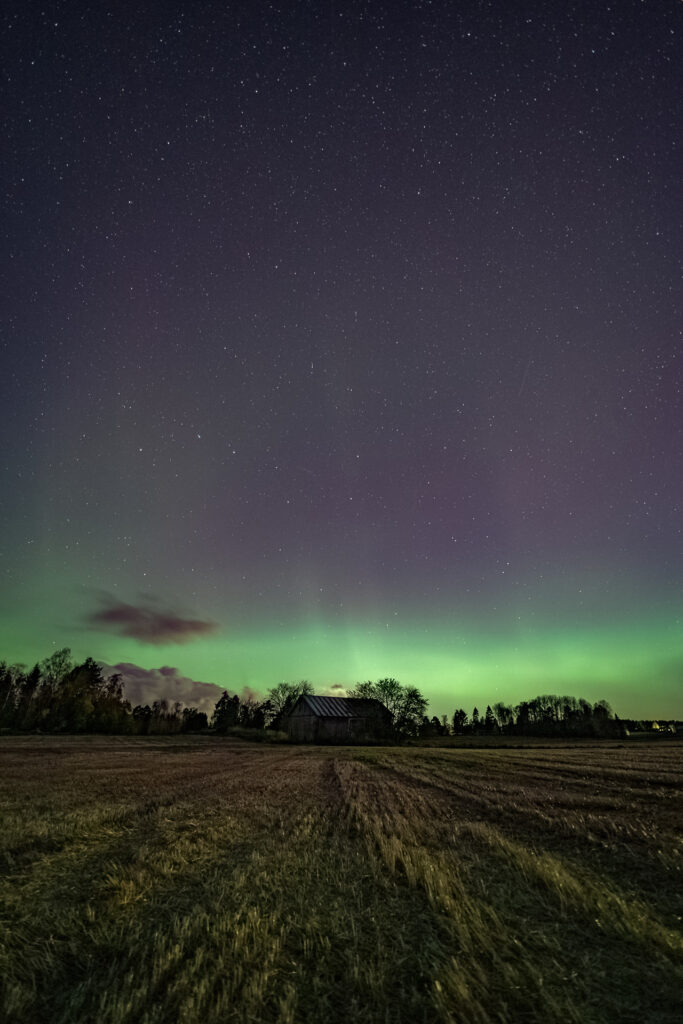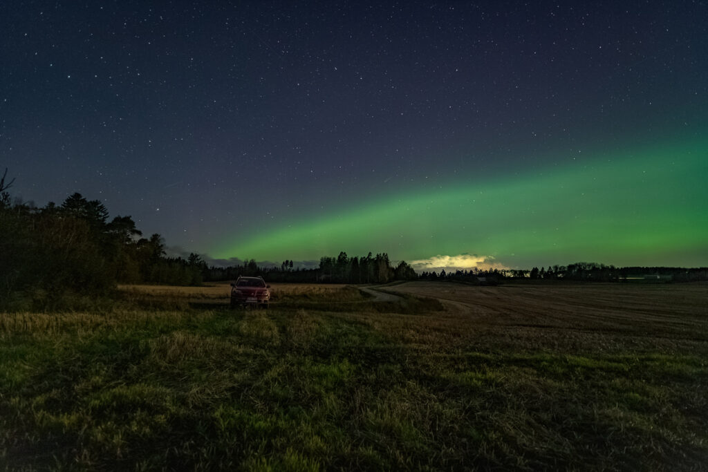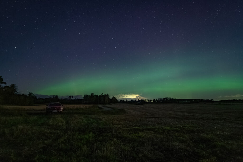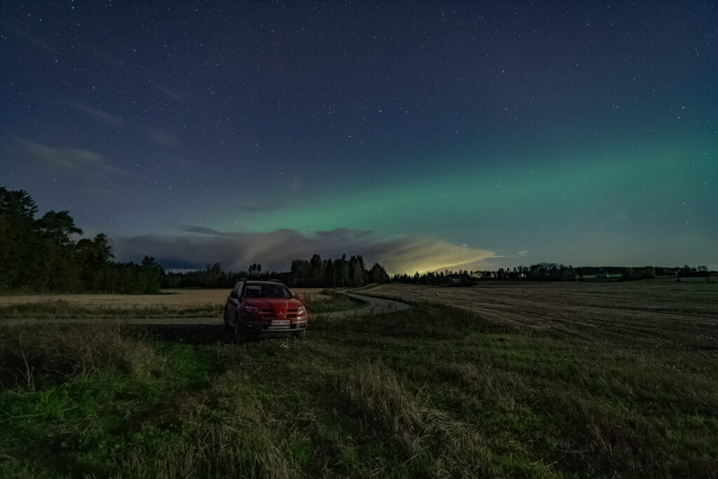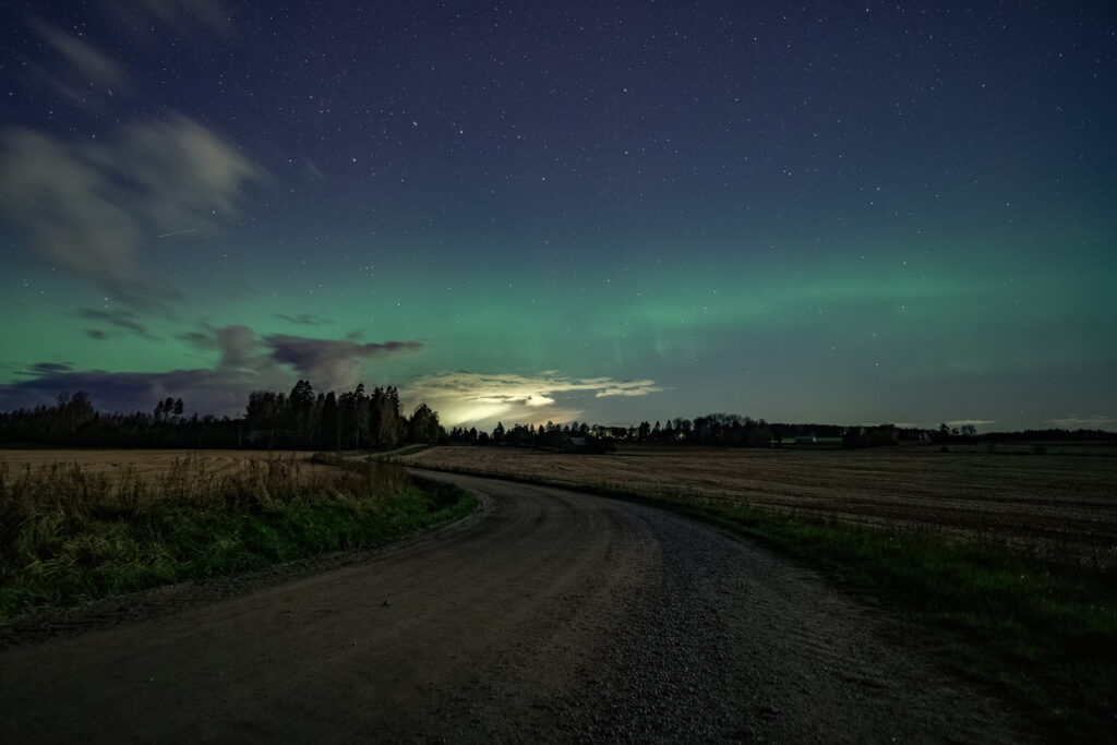 Lähdin ajelemaan mietteissäni kotia kohti. En oikein vieläkään voinut käsittää tapahtunutta. Mukanani ei edes ollut koiraa, joka olisi voinut hyökkäyksen jotenkuten selittää. Tapahtunut tuntui täysin mysteeriltä. Todennäköisesti supikoira oli siirtynyt ”isännöimään” autiotilaa edellisen käyntini jälkeen eli muutama kuukausi sitten ja olin vahingossa tullut loukanneeksi sen reviiriä. Kun sain Hitsin parkkerattua tutun pellon liittymään, alkoi tärinä. Puristin ohjauspyörää, happi ei kulkenut, hiki löi pintaan ja ymmärsin, että olin saamassa paniikkikohtausta. Otin avuksi hengitysharjoitukset ja ajattelin samalla ”täällä ei ole mitään hätää, nyt ollaan tutussa ympäristössä, rauhoitu”. Silittelin henkisesti itseäni selästä ja ihme kyllä, rauhoituin. Hengittelin muutaman minuutin syvään. Paniikkikohtaus ja puristus rinnassa hellitti. Seuraavaksi vilkaisin sivuikkunasta ulos ja hätkähdin-taivaalle oli ajomatkani aikana kiivennyt todella korkealla kulkeva revontulikaari! Loikkasin autosta ulos edelleen kyllä hieman huterin jaloin ja pystytin jalustan ja kameran. Käsien tärinä sai homman hidastumaan entisestään ja pelkäsin pudottavani kameran. Lopulta kaikki oli valmiina ja seisoin hetken auton vieressä. Nyt pitäisi uskaltaa lähteä pimeään. Sytytin otsavalon, säädin sen minimille ja sukelsin tutulle pellolle kantaen sylissäni kameraa ja jalustaa. Seuraava pari tuntia kului rattoisasti sommitellen revontulia ja maisemaa kuviin. Keho rauhoittui ja vaikka susien ulvontaa kuului Torren suunnalta, se ei tehnyt kovin isoa vaikutusta. Äänet pysyivät kaukana eivätkä lähestyneet. Revontulikaari oli hauskan riekaleinen ja luulen sen johtuneen siitä, että bz ja bt-nimiset arvot heittelivät rajusti. Kaari ei tavallaan päässyt kehittymään kunnolla.