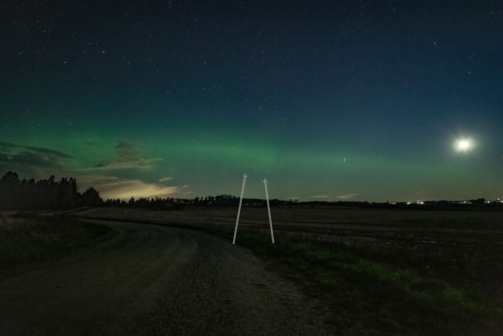 Hieman ennen puoltayötä taivaalla jonkinnäköisiä sykkiviä revontulia, joita Kuu häiritsi todella paljon. Revontulikaaressa näkyi omituisia ”piikkejä” joita ensin ajattelin fragmenteiksi, mutta ne eivät sitä olleet. Lähimpänä olisi ehkä kuvaus ”jonkin sortin picket fence kamaa”, kylläkin ilman Steve-kaarta ja piikit vallan väärässä paikassa eli revontulikaaren joukossa. Sain muutaman ruudun otettua niistä, kuvat eivät ole kauneinta kärkeä, mutta ilmiö erottuu hyvin. Tässä kohtaa piti säätää kameran asetuksia aika rajuiksi, jotta ilmiö tarttui ylipäänsä kuviin. Vähänkin liian pitkä valotusaika, niin piikit suttaantuivat epäselväksi muhjuksi ja hävisivät Kuun valoon. Matalat isot jättivät puolestaan kuvan niin tummaksi Kuusta huolimatta, että ilmiötä ei oikein saanut edes Ligtroomissa nätisti näkymään. En ole ihan varma, mitä nuo kaverit olivat revontuliaan, mutta luulisin, että jonkinnäköisiä hirmu skarppeja sykkiviä läiskiä, kylläkin hieman oudomman näköisiä kuin yleensä. Toinen arvaus menee säteittäisen huonosti muodostuneen revontulivyön kannalle. Kymmenen vuoden maastossa reissaamisten ja satojen revontulien ikuistamisen jälkeen en ole kyllä ihan vastaavia onnistunut vielä näkemään tai kuvaamaan.