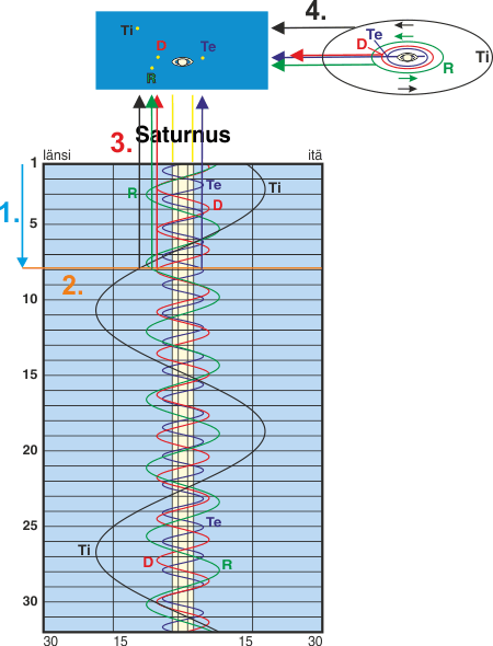 Vaihe 3. (Kuiden käyrien värien mukaiset nuolet) Luemme kuiden etäisyyden Saturnuksen kiekon ja renkaiden suhteen.